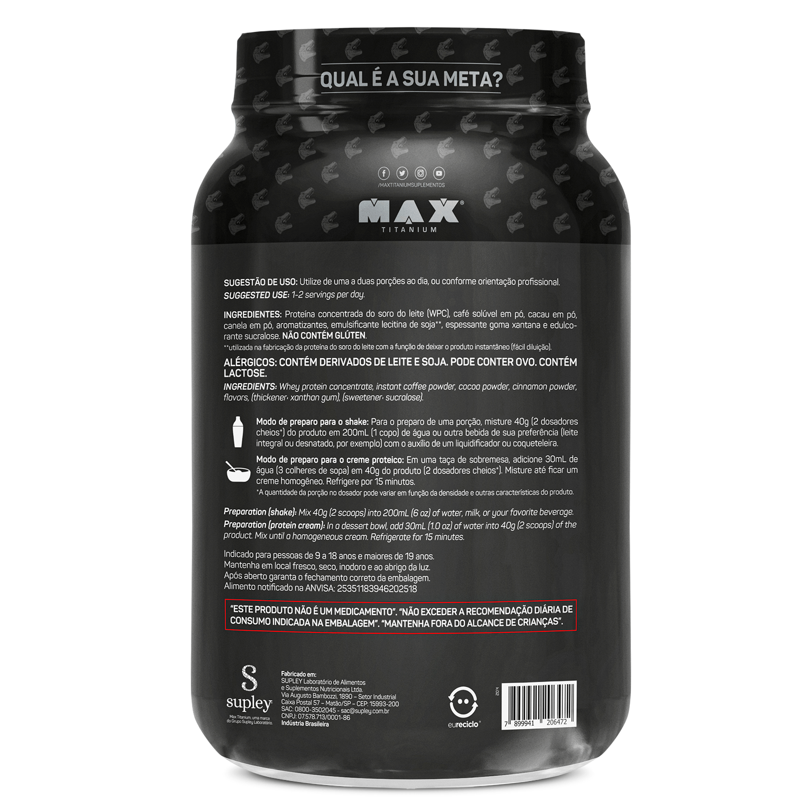 Proteína concentrada do soro do leite (WPC), café solével em pó, cacau alcalino em pó, canela em pó, aromatizantes, emulsificante lecitina de soja**, espessante goma xantana e edulcorante sucralose. NÃO CONTÉM GLéTEN.