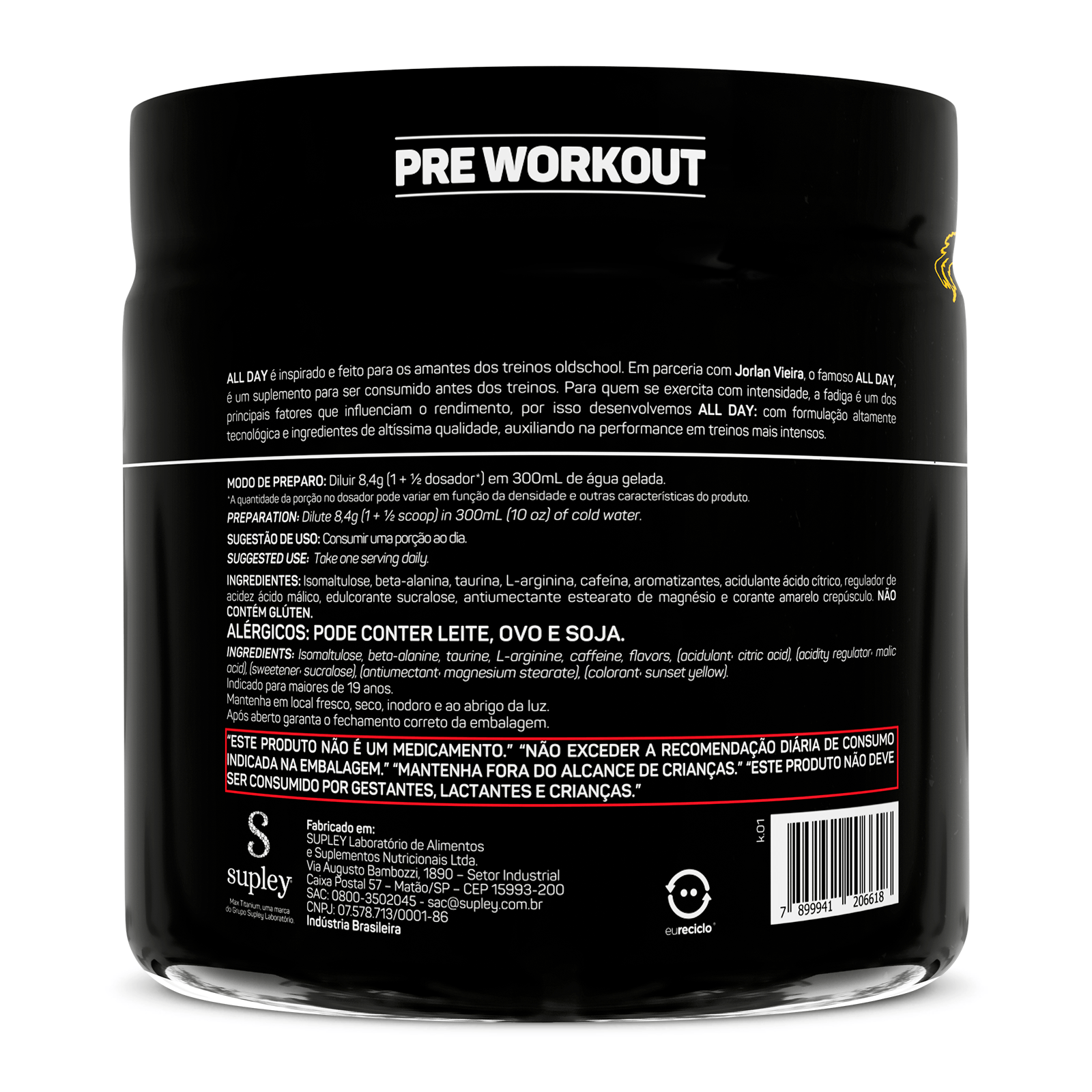 ALL DAY é inspirado e feito para os amantes dos treinos oldschool. Em parceria com Jorlan Vieira, o famoso ALL DAY, é um suplemento para ser consumido antes dos treinos. Para quem se exercita com intensidade, a fadiga é um dos principais fatores que influenciam o rendimento, por isso desenvolvemos ALL DAY: com formulação altamente tecnológica e ingredientes de altíssima qualidade, auxiliando na performance em treinos mais intensos.