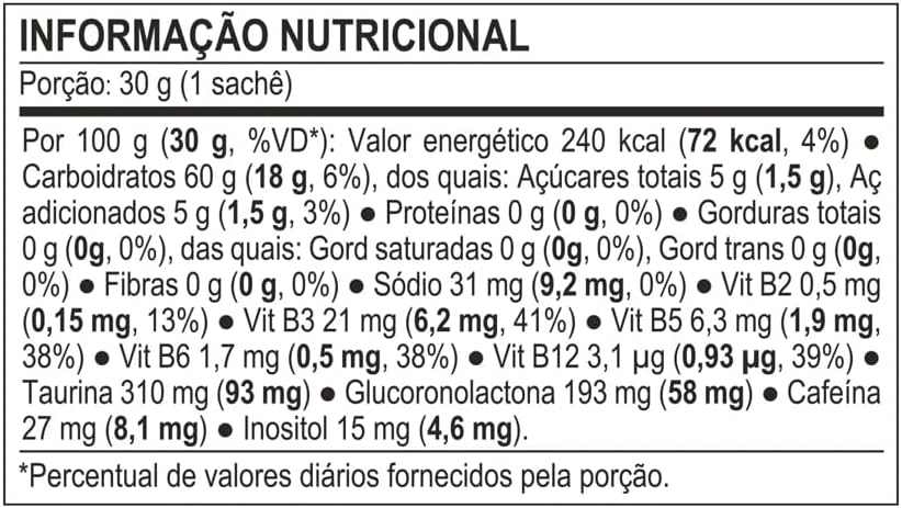 Maltodextrina, água purificada, taurina (93mg/30g), glucoronolactona (58mg/30g), cafeína (8,1mg/30g), nicotinamida (niacina), inositol (4,6mg/30g), pantotenato de cálcio (ácido pantotênico), cloridrato de piridoxina (vitamina B6), riboflavina (vitamina B2), cianocobalamina (vitamina B12), amido de milho ceroso (waxy maize), regulador de acidez citrato monossódico, acidulante ácido fosfórico, aromatizante, conservadores sorbato de potássio e benzoato de sódio e edulcorante sucralose.