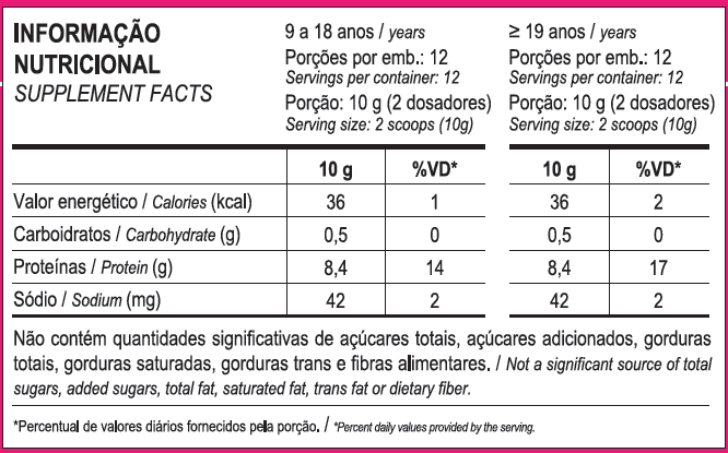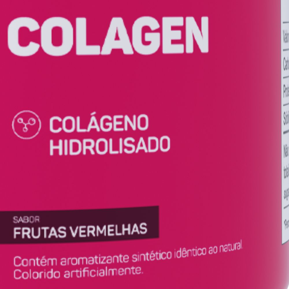 Colágeno hidrolisado, acidulante ácido cítrico, aromatizante, edulcorante sucralose, espessante goma guar, antiumectante dióxido de silício e corantes amaranto e azul brilhante FCF.