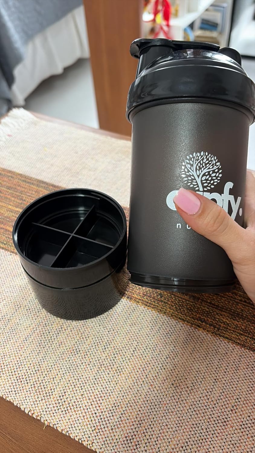 - 🗂️ Divisórias e compartimento inteligente: A shakeira conta com divisórias internas, facilitando o armazenamento de diferentes suplementos e comprimidos em um só lugar.