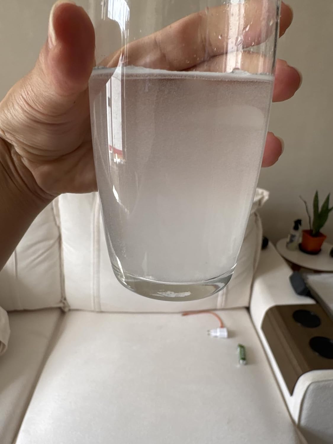 Estava satisfeita, usei por uma semana antes de avaliar. No entanto, hoje quando fui ingerir (eu tomo puro, sem água), senti algo estranho na boca e vi que eram dois pedacinhos de vidro. Me apavorei. Daí fiz o teste da água e, no primeiro momento, ela ficou branca. Depois ela foi se depositando no fundo do copo. A princípio o produto parece ser de bom custo benefício. Mas os pedaços de vidro, além de perigosos, são um ponto de atenção.