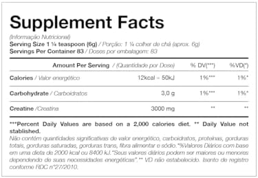 - Absorção potencializada com Maltodextrina: A combinação de creatina com maltodextrina estimula um pico de insulina que acelera o transporte da creatina para dentro das células musculares, aumentando sua captação e otimizando resultados de força, energia e volume muscular.