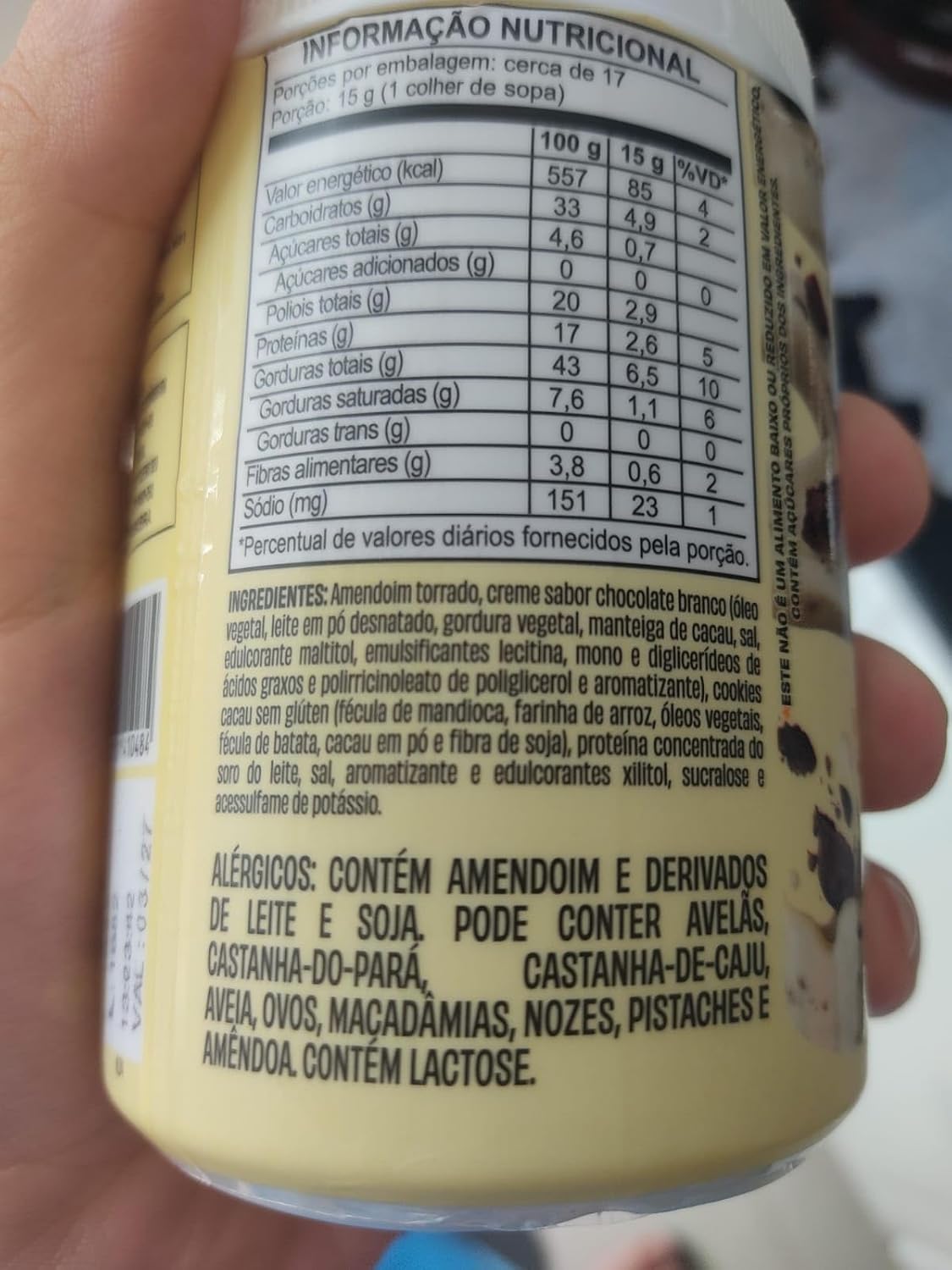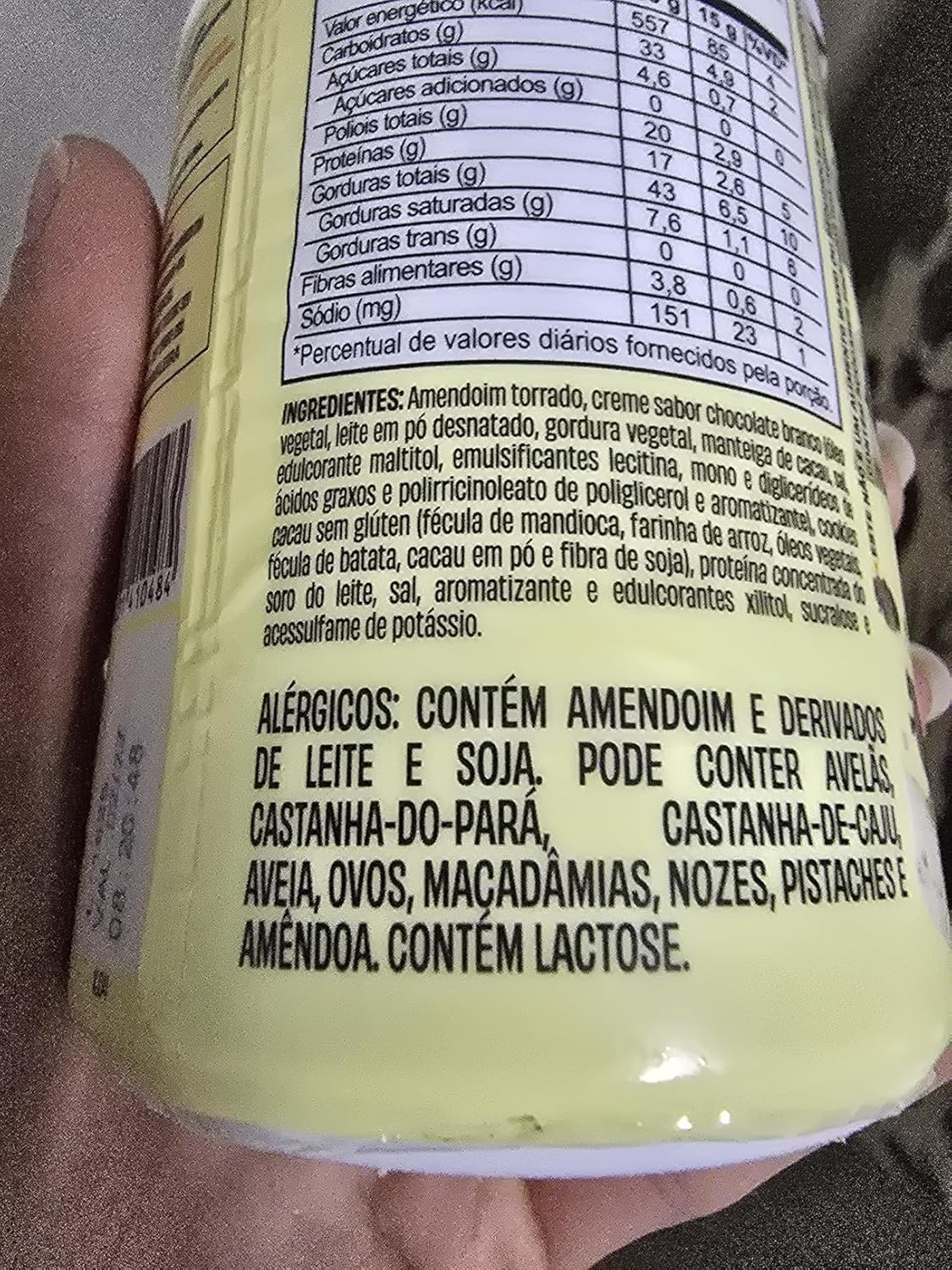 Amendoim torrado, creme sabor chocolate branco (óleo vegetal, leite em pó desnatado, gordura vegetal, manteiga de cacau, sal, edulcorante maltitol, emulsificantes lecitina, mono e diglicerídeos de ácidos graxos e polirricinoleato de poliglicerol e aromatizante sintético idêntico ao natural), cookies cacau sem glúten, whey protein sabor baunilha, enzima lactase, sal e edulcorantes: xilitol, sucralose e acessulfame de potássio.