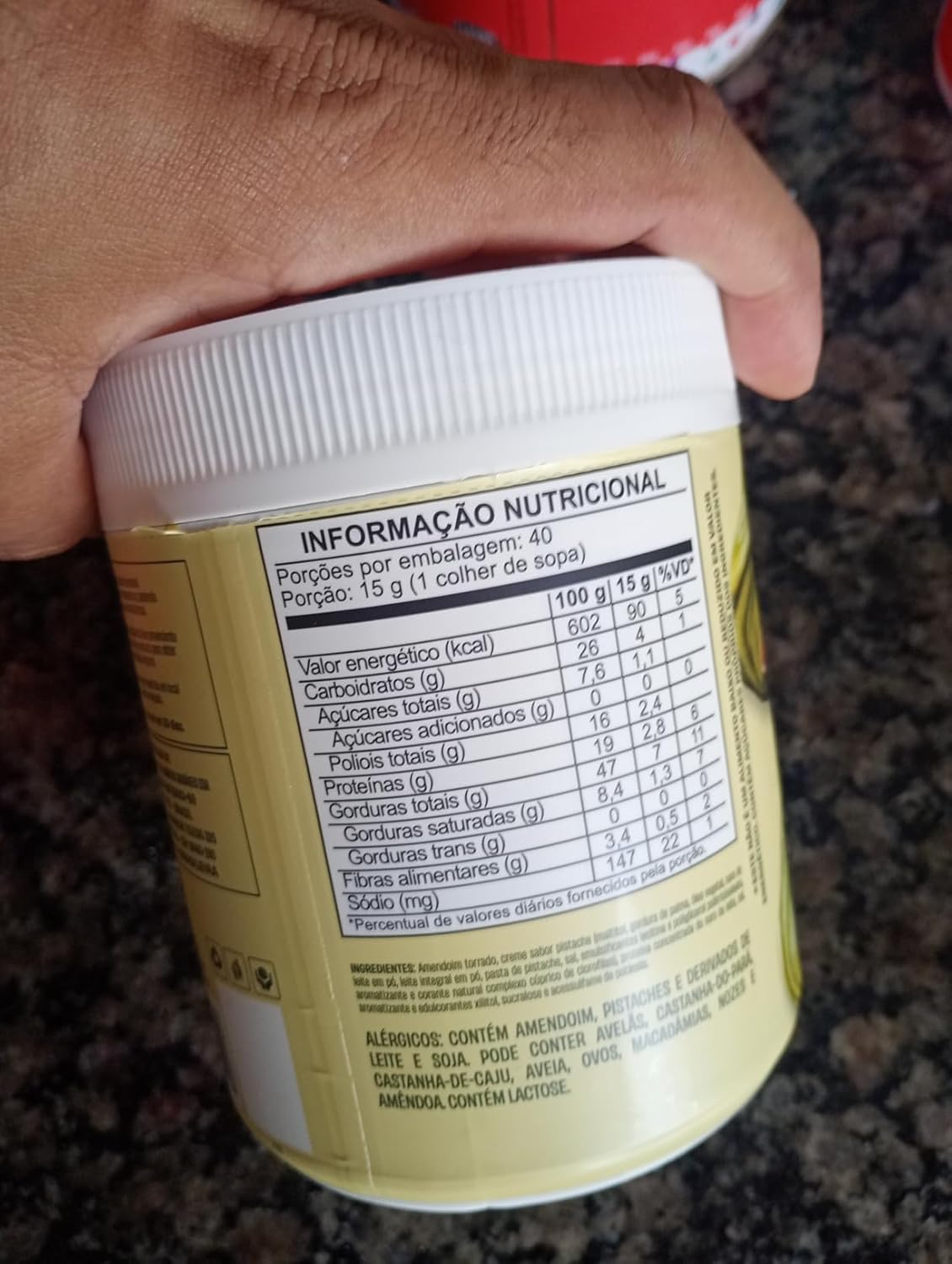 Amendoim torrado, creme sabor pistache (maltitol, gordura de palma, leite integral em pó, soro de leite em pó, óleo vegetal, pasta de pistache, emulsificantes lecitina de soja e poliglicerol polirricinoleato, sal, aroma idêntico ao natural, corante clorofila natural), whey protein, sal, enzima lactase e edulcorantes: xilitol, sucralose e acessulfame de potássio.
