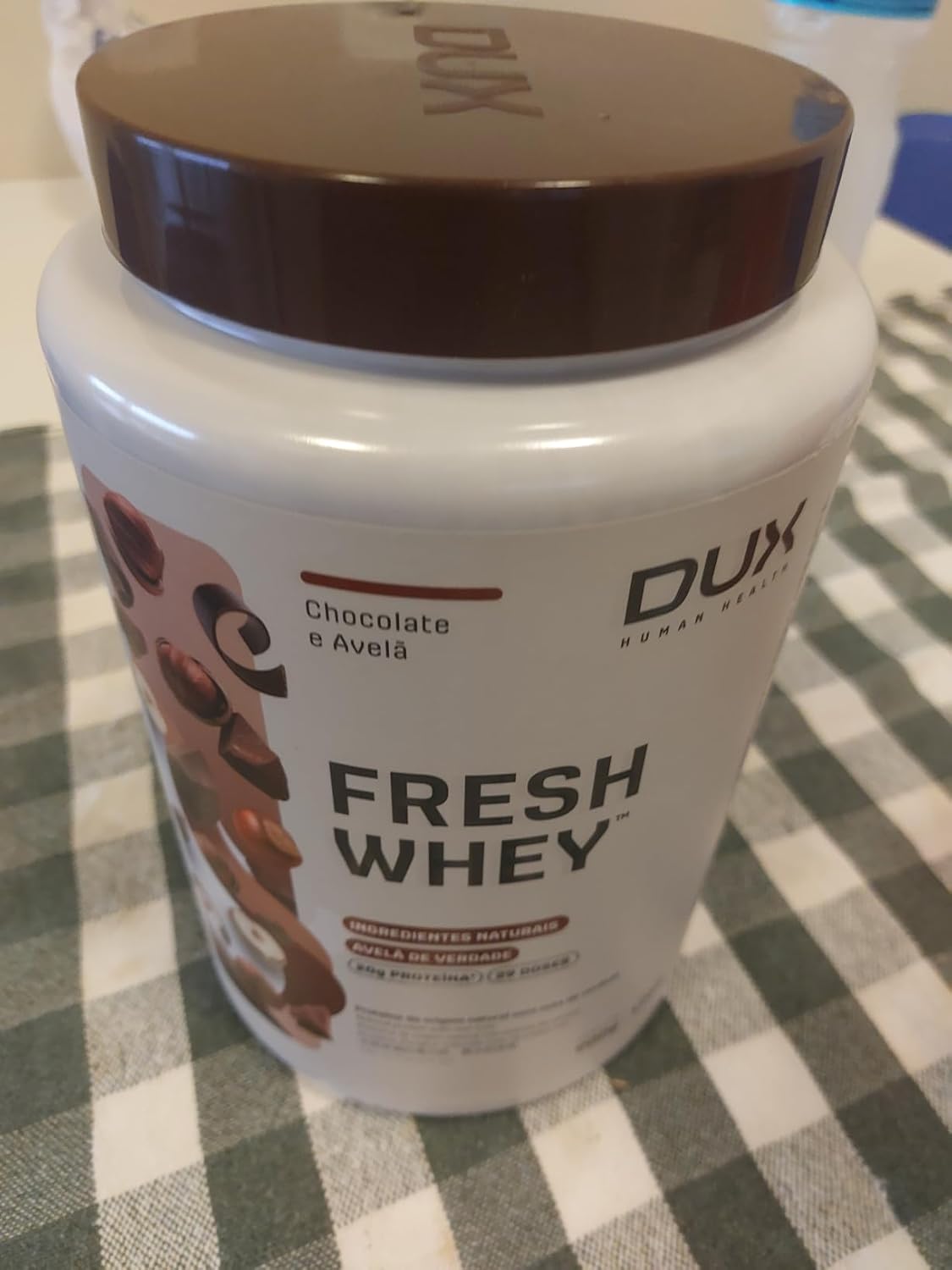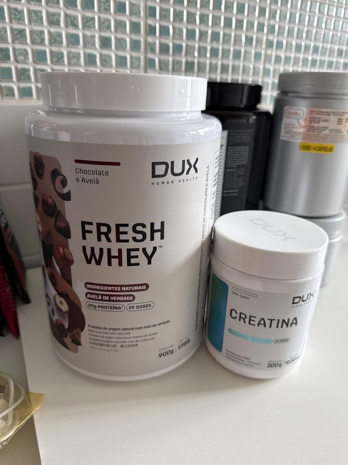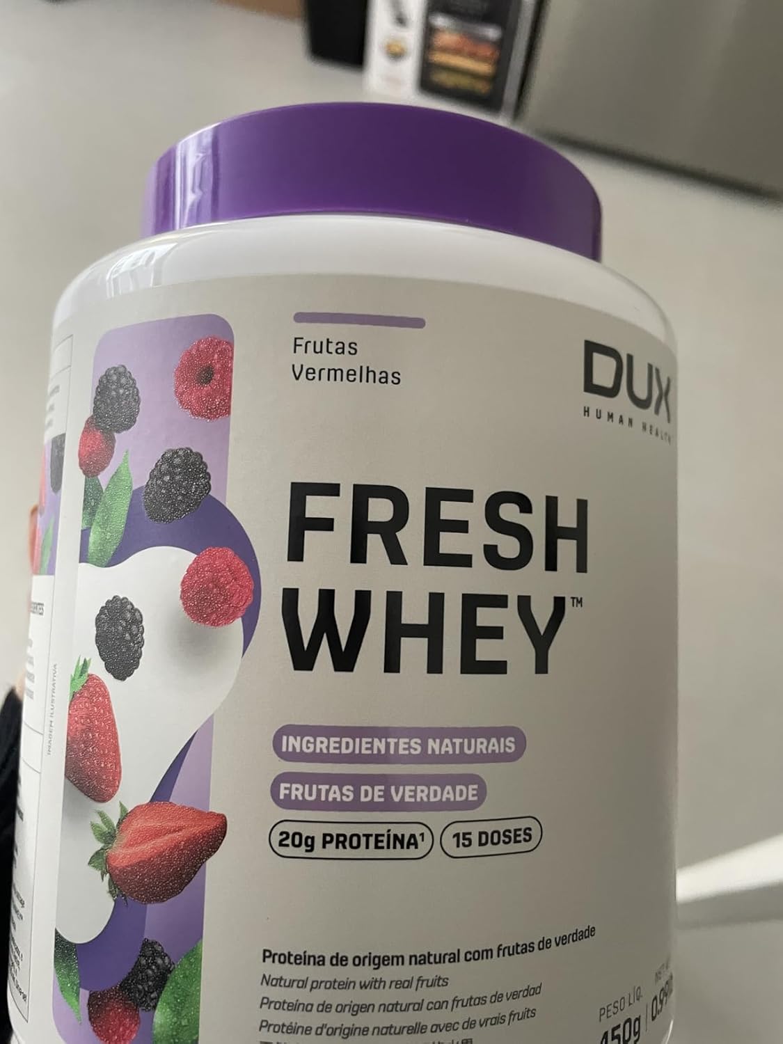 Comprei primeiro o de 450g e achei excelente, desta vez comprei o de 900g porém o que me chamou muito a atenção foi que a tampa do corredor veio branco, diferente do descrito e tavam do que aparece no site da Dux, o mesmo aconteceu com a creatina, todos com tampa branca.Confesso que até agora estou cismada, provei hoje e talvez por estar com o pé atrás, achei o gosto um pouquinho diferente do primeiro que comprei também aqui na nessa loja.