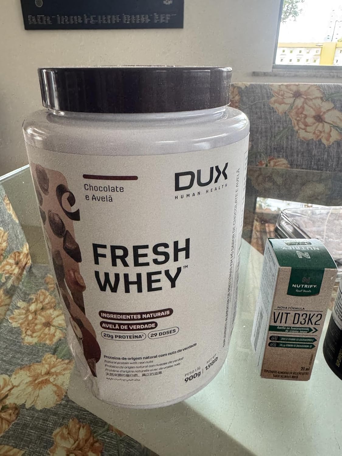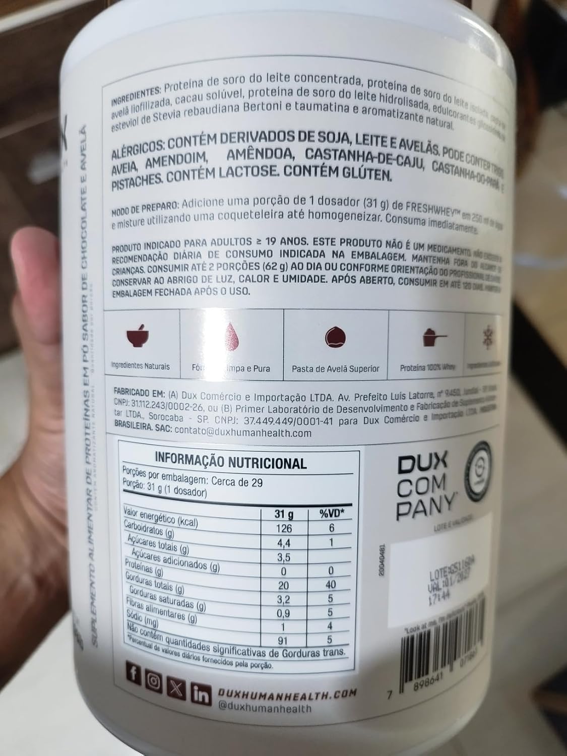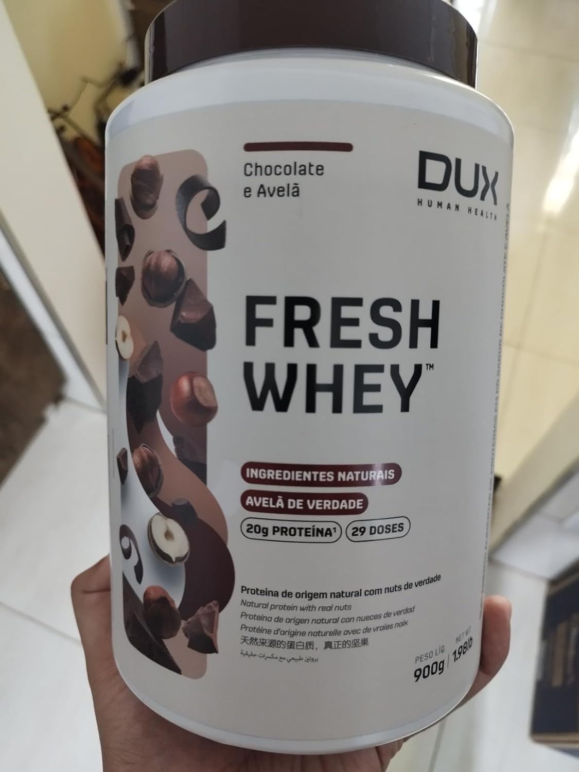 Comprei primeiro o de 450g e achei excelente, desta vez comprei o de 900g porém o que me chamou muito a atenção foi que a tampa do corredor veio branco, diferente do descrito e tavam do que aparece no site da Dux, o mesmo aconteceu com a creatina, todos com tampa branca.Confesso que até agora estou cismada, provei hoje e talvez por estar com o pé atrás, achei o gosto um pouquinho diferente do primeiro que comprei também aqui na nessa loja.