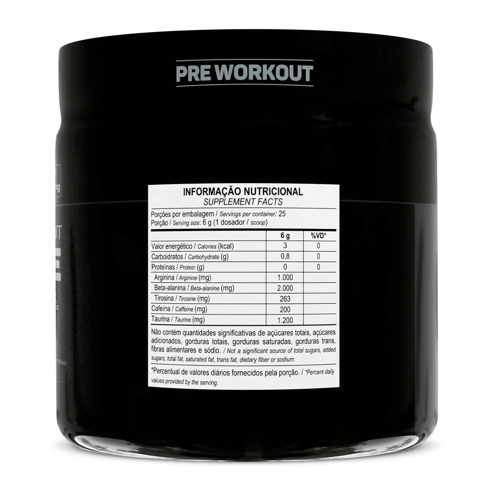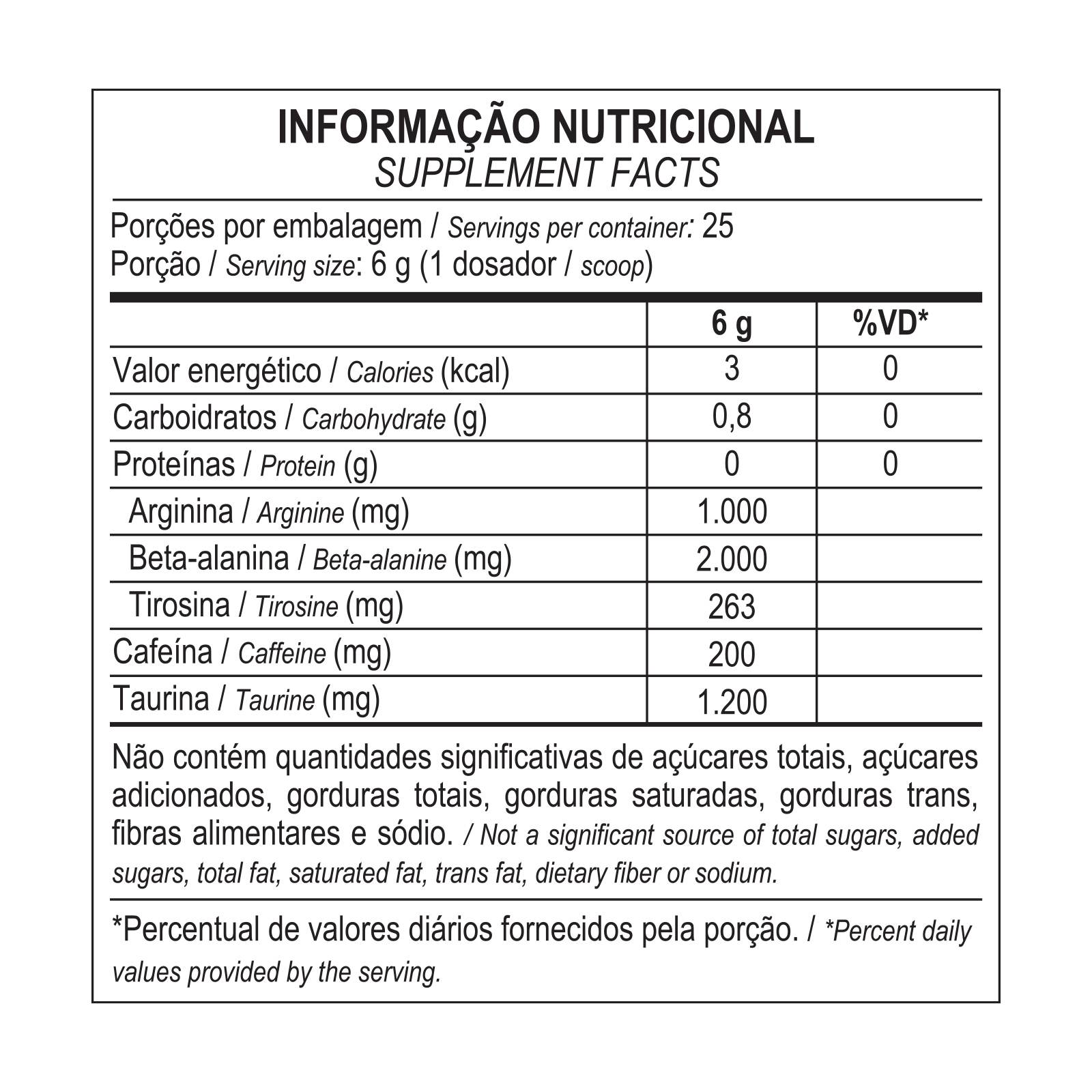 Beta-alanina, taurina, L-arginina, tirosina, cafeína, aromatizantes, regulador de acidez ácido málico, acidulante ácido cítrico, edulcorante sucralose, antiumectante estearato de magnésio e corantes artificiais amaranto e azul brilhante fcf.