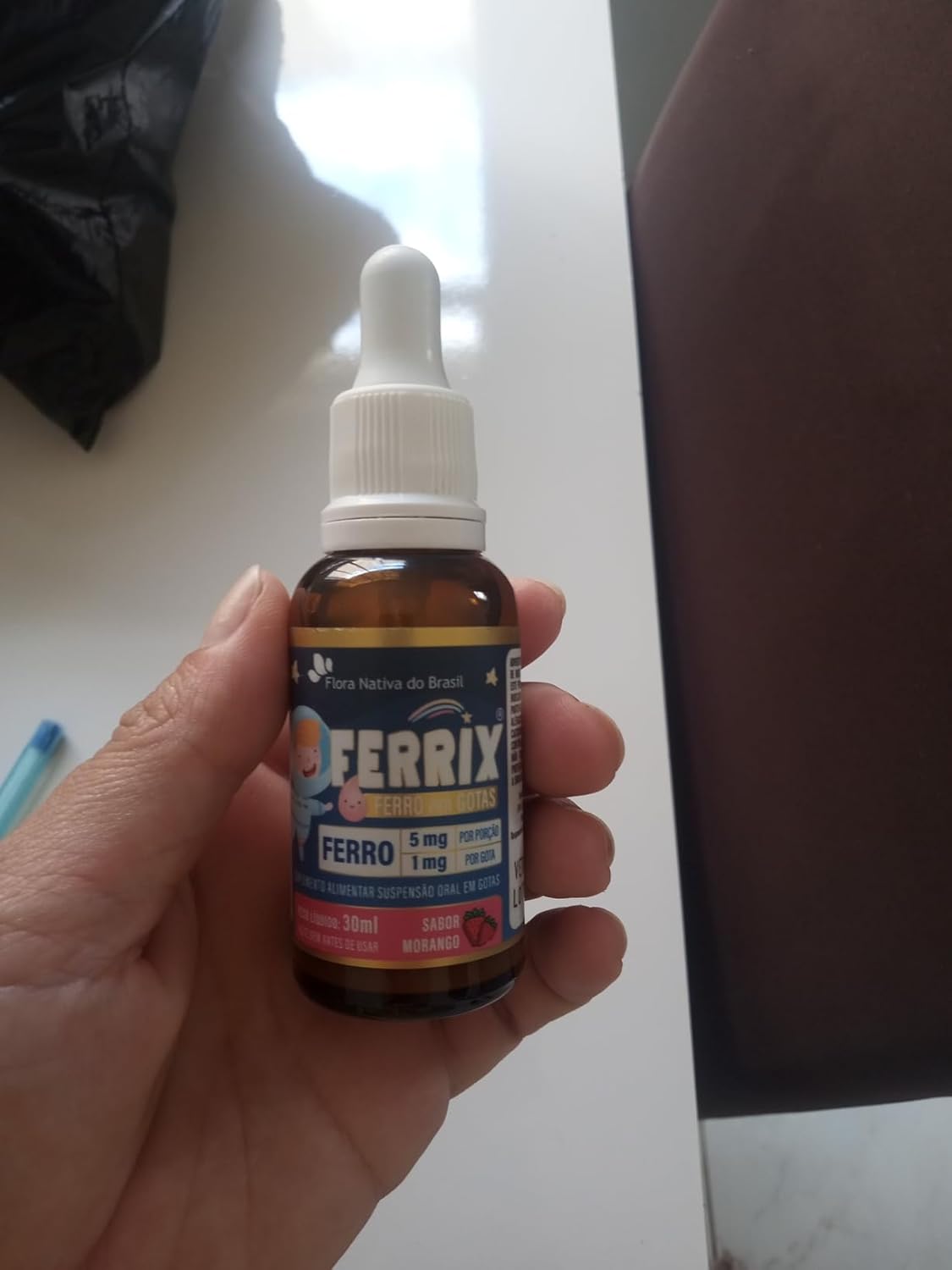 O pediatra indicou, gostinho bom e não faz sujeira igual o Dexfer. Mas estranhei o produto estar quase no fim em pouco tempo de uso, tirei o rótulo e vi esse tanto no fundo. Sempre agito, achei estranho porque não se misturou. Está dentro da validade.
