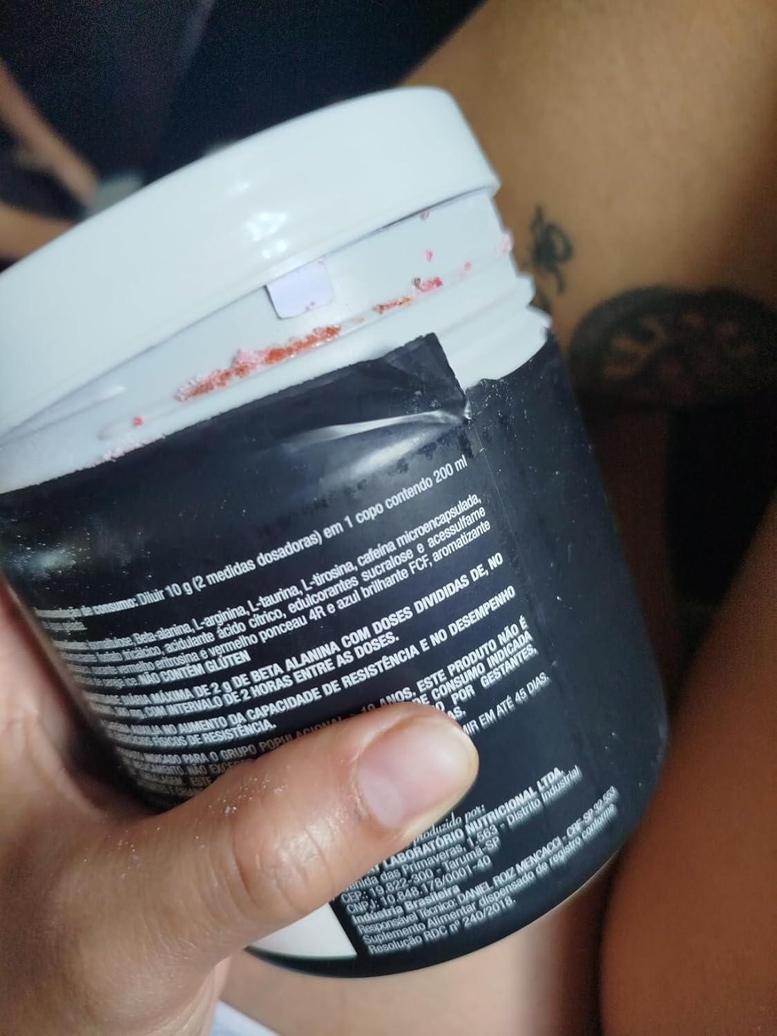 Ingredientes: Isomaltulose, Beta-Alanina, L-arginina, L-taurina, L-tirosina, cafeína micro encapsulada, antiumectante fosfato tricálcico, acidulante ácido cítrico, edulcorantes sucralose e acessulfame potássico, corante vermelho allura e aromatizante artificial de energético.