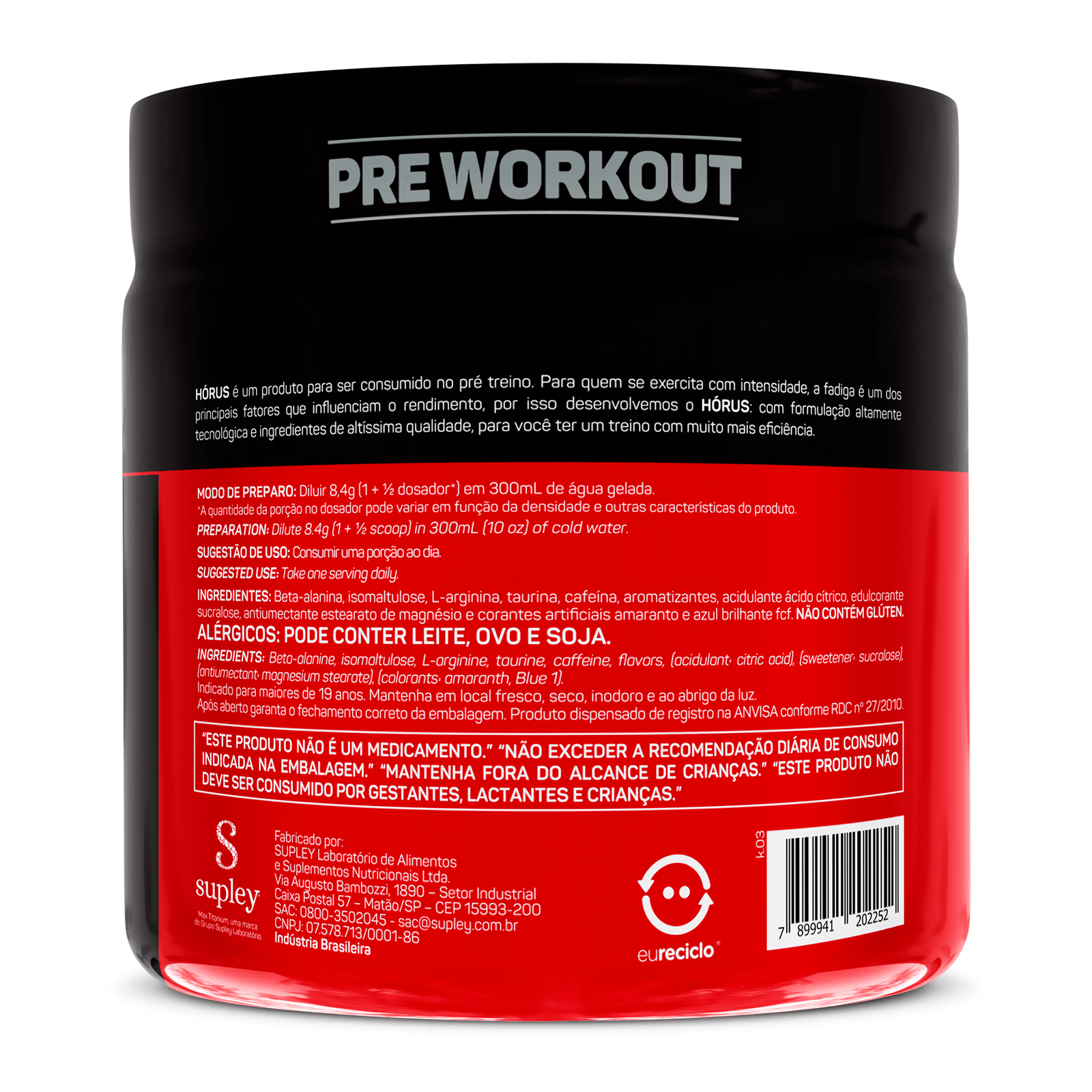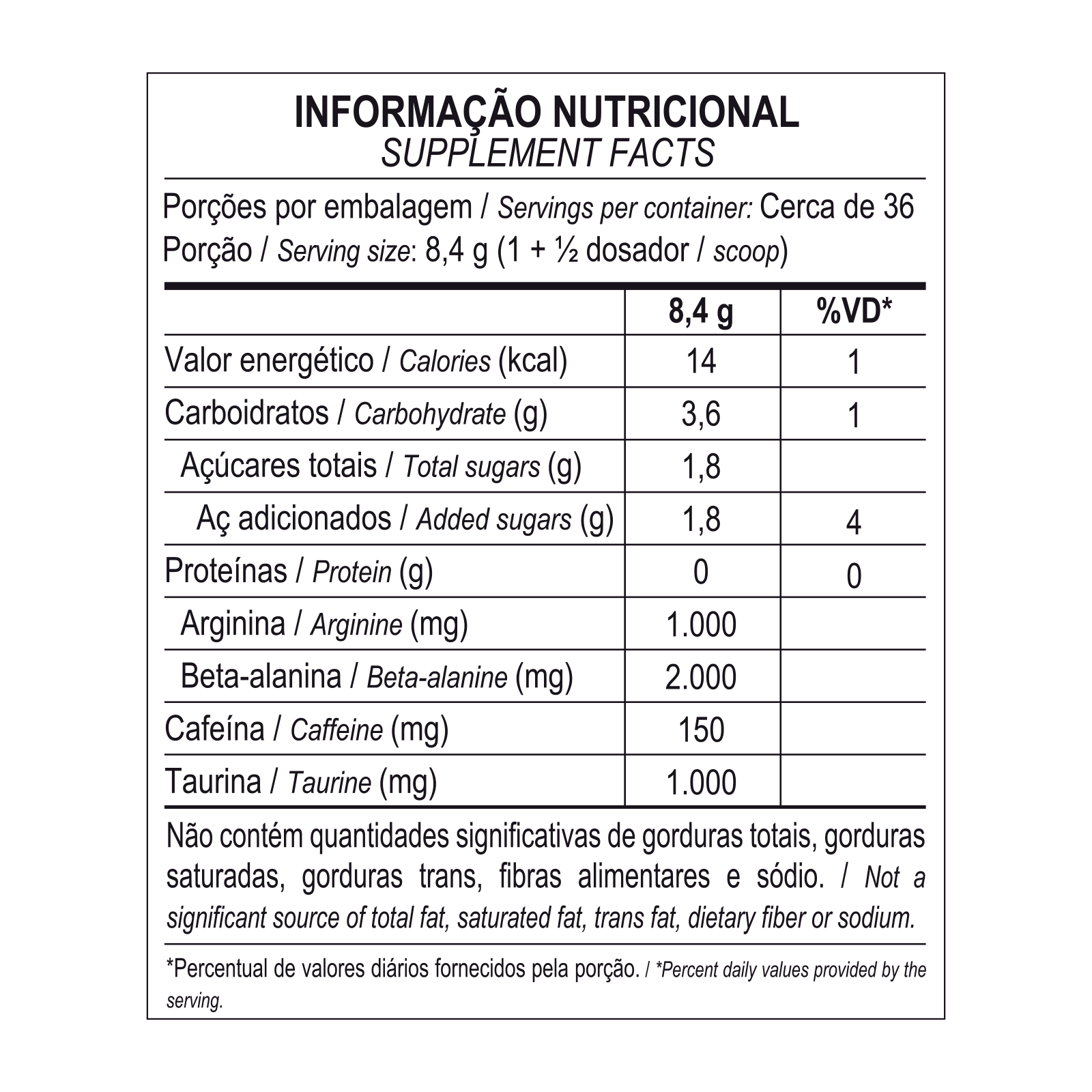 Beta-alanina, isomaltulose, L-arginina, taurina, cafeína, aromatizantes, acidulanteácido cítrico, edulcorante sucralose, antiumectante dióxido de silício e corantes artificiais amaranto e azul brilhante fcf. NÃO CONTÉM GLÚTEN.n