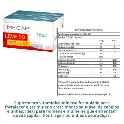 Imecap® Hair Leve 90 cápsulas, Pague 60 – Vitaminas para Cabelos e Unhas com Biotina O que é e para que serve o suplemento Imecap® Hair Leve 90 cápsulas, Pague 60? Imecap® Hair Cápsulas é um suplemento alimentar formulado com nutrientes como Biotina, Cromo, Piridoxina, Selênio e Zinco, é indicado para homens e mulheres. Imecap® Hair Cápsulas é uma solução prática, com apenas 1 cápsula ao dia, sem glúten e zero calorias, ideal para manutenção dos cabelos e unhas. Como tomar Imecap® Hair Leve 90 cápsulas, Pague 60? Ingerir 1 (uma) cápsula por dia, após refeição. Uso adulto (≥ 19 anos). Uso oral. Benefícios e diferenciais • Suplemento alimentar em cápsulas para cabelos e unhas. • Manutenção de cabelos e unhas. • Com Biotina, Cromo, Piridoxina, Selênio e Zinco. • Apenas 1 cápsula ao dia. • Sem glúten. • Zero calorias. Composição Colágeno hidrolisado, óxido de zinco, maltodextrina*, cloridrato de piridoxina, picolinato de cromo, selenito de sódio, D-biotina. Agente de massa: celulose microcristalina. Antiumectante: dióxido de silício e estearato de magnésio. Cápsulas: Gelificante: gelatina. Corantes: dióxido de titânio, azorrubina (carmoisina), azul brilhante FCF e amarelo de quinoleína. (*) fornece quantidades não significativas de açúcares. NÃO CONTÉM GLÚTEN. NÃO CONTÉM AÇÚCARES. NÃO CONTÉM VALOR ENERGÉTICO. Tabela Nutricional Porções por embalagem: 60 Porção: 0,5 g (1 cápsula) 0,5 g %VD* Valor energético (kcal) 0 0 Carboidratos (g) 0 0 Açúcares totais (g) 0 Açúcares adicionados (g) 0 0 Vitamina B6 (mg) 1,3 100 Biotina (μg) 30 100 Cromo (μg) 35 100 Selênio (μg) 34 57 Zinco (mg) 7 64 Não contém quantidades significativas de proteínas, gorduras totais, gorduras saturadas, gorduras trans, fibras alimentares e sódio. *Percentual de valores diários fornecidos pela porção. *% Valores Diários com base em uma dieta de 2.000 kcal ou 8.400 kJ. Seus valores diários podem ser maiores ou menores, dependendo de suas necessidades energéticas. Advertências ESTE PRODUTO NÃO É UM MEDICAMENTO. NÃO EXCEDER A RECOMENDAÇÃO DIÁRIA DE CONSUMO INDICADA NA EMBALAGEM. MANTENHA FORA DO ALCANCE DE CRIANÇAS. Conservar em temperatura ambiente (entre 15 °C e 30 °C). Proteger da luz e umidade.