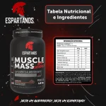 Muscle Mass fornece por dose 20g proteínas de alto valor biológico e diferentes níveis de absorção, contém também 125g de carboidratos complexos de rápida e lenta absorção deixando assim o atleta em estado anabólico por muito mais tempo. Muscle Mass é um hipercalórico completo com alto teor de aminoácidos de cadeia ramificada Bcaa’s e não contém gluten, combinação perfeita para o ganho de massa muscular com um sabor incomparável. Itens Inclusos: 1 Potes Muscle Mass Anti-Catbolic Espartanos 1800G