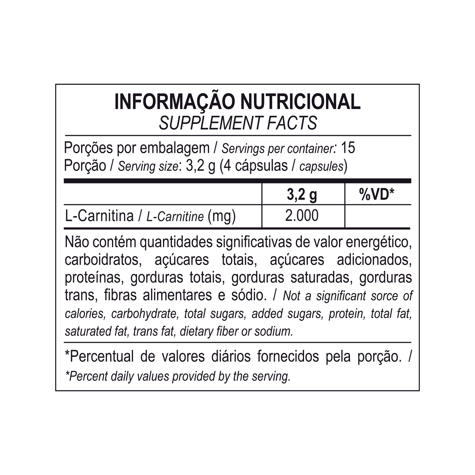 Tartarato de L-Carnitina, amido de milho, antiumectante fosfato tricélcico e cápsula (gelatina, corantes dióxido de titânio, vermelho 40, azorrubina e amarelo de quinoleéna).