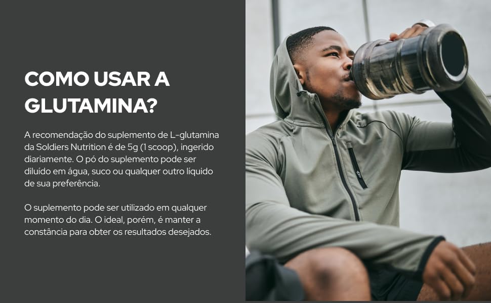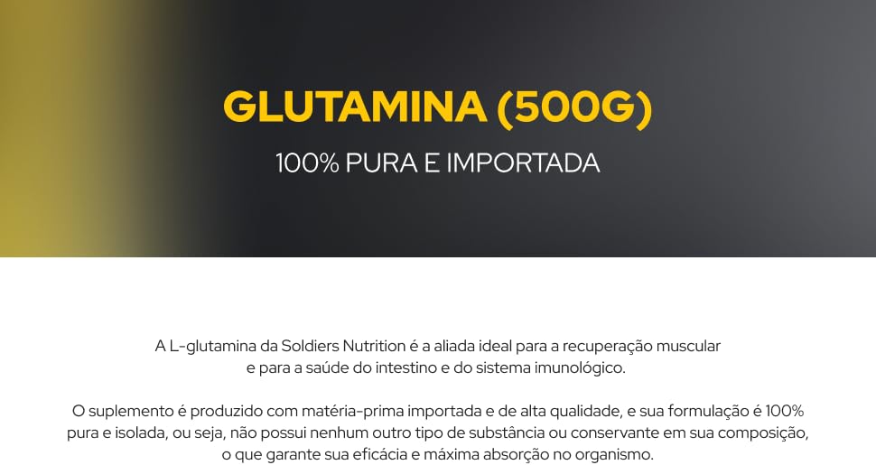 - L-Glutamina 500g - 100% Pura Importada - Soldiers NutritionAcompanha Colher Dosadora 5gA glutamina é a proteína mais abundante no nosso corpo e é sintetizada a partir das necessidades do organismo. Esse aminoácido corresponde a 20% do total de aminoácidos e essa quantidade é 2 vezes maior que a alanina. Ela é desenvolvida a partir de 3 substâncias: ácido glutâmico (o grupo amida), valina e isoleucina. Para ser metabolizada, duas enzimas são necessárias sendo uma delas a glutamina sintetase, fazendo a interação do glutamato com a amônia e a outra, é a glutaminase. A síntese da glutamina ocorre, em primeiro lugar e principalmente, nos músculos.