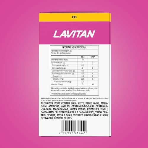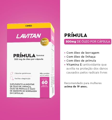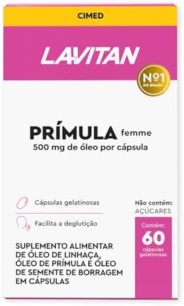Lavitan Primula Femme possui óleo de prímula, borragem e linhaça. É um suplemento alimentar composto por gorduras essenciais, como o ácido alfa-linolênico. Esses ácidos graxos são importantes para a saúde, pois não são produzidos pelo organismo e devem ser obtidos por meio da alimentação. O óleo de prímula é indicado para o alívio dos sintomas da TPM e menopausa, como cólicas, inchaço, alterações de humor e ansiedade. Além disso, pode ajudar a melhorar a saúde cardiovascular, prevenir o diabetes tipo 2, melhorar a pele e aliviar os sintomas de dermatites.