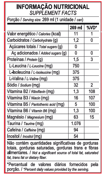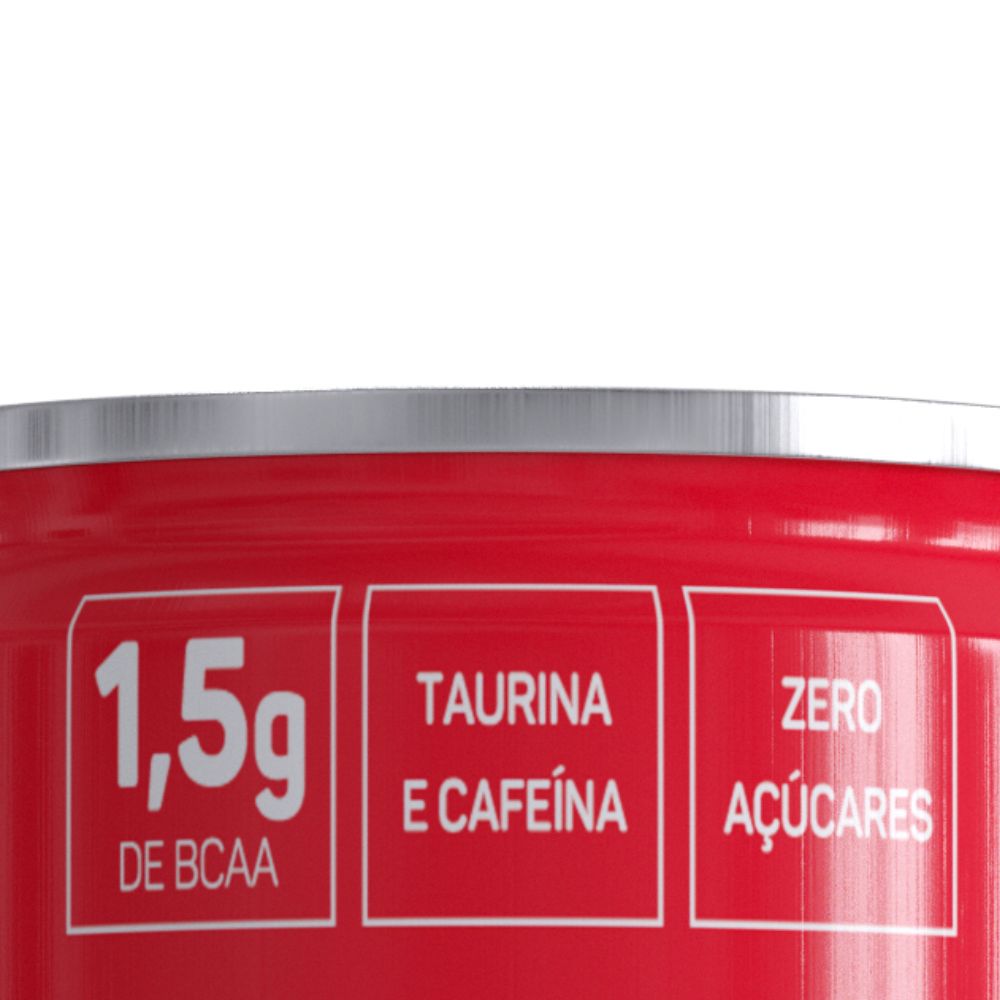 Além de conter cafeína e taurina, ele conta com vitaminas magnésio, 1,5g de BCAA e zero açúcares.