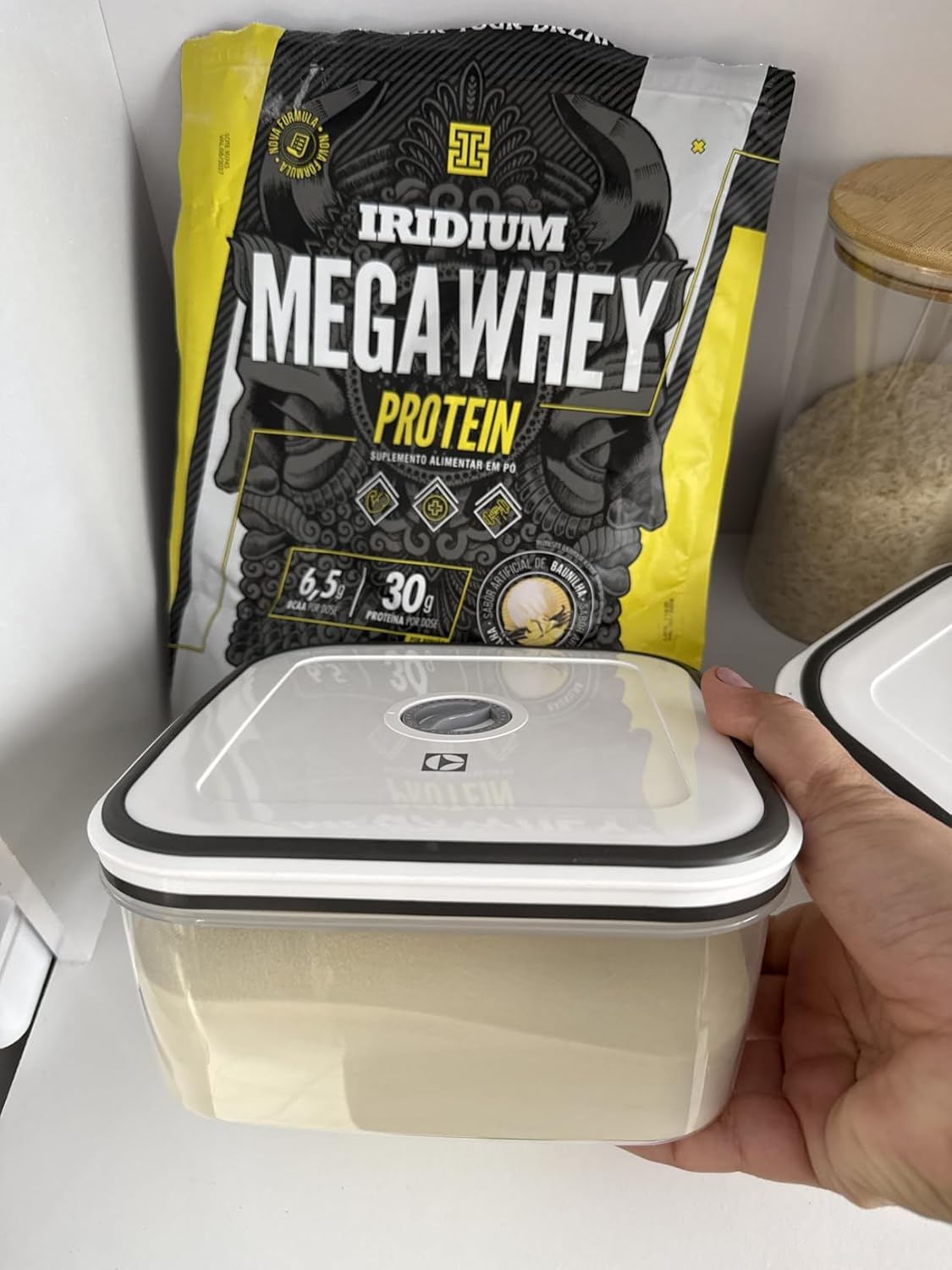Produto de qualidade, veio bem embalado, como nao tenho o pote do whey para armazenamento coloquei em uma vasilha para conservar melhor
