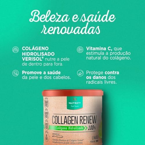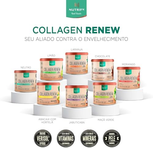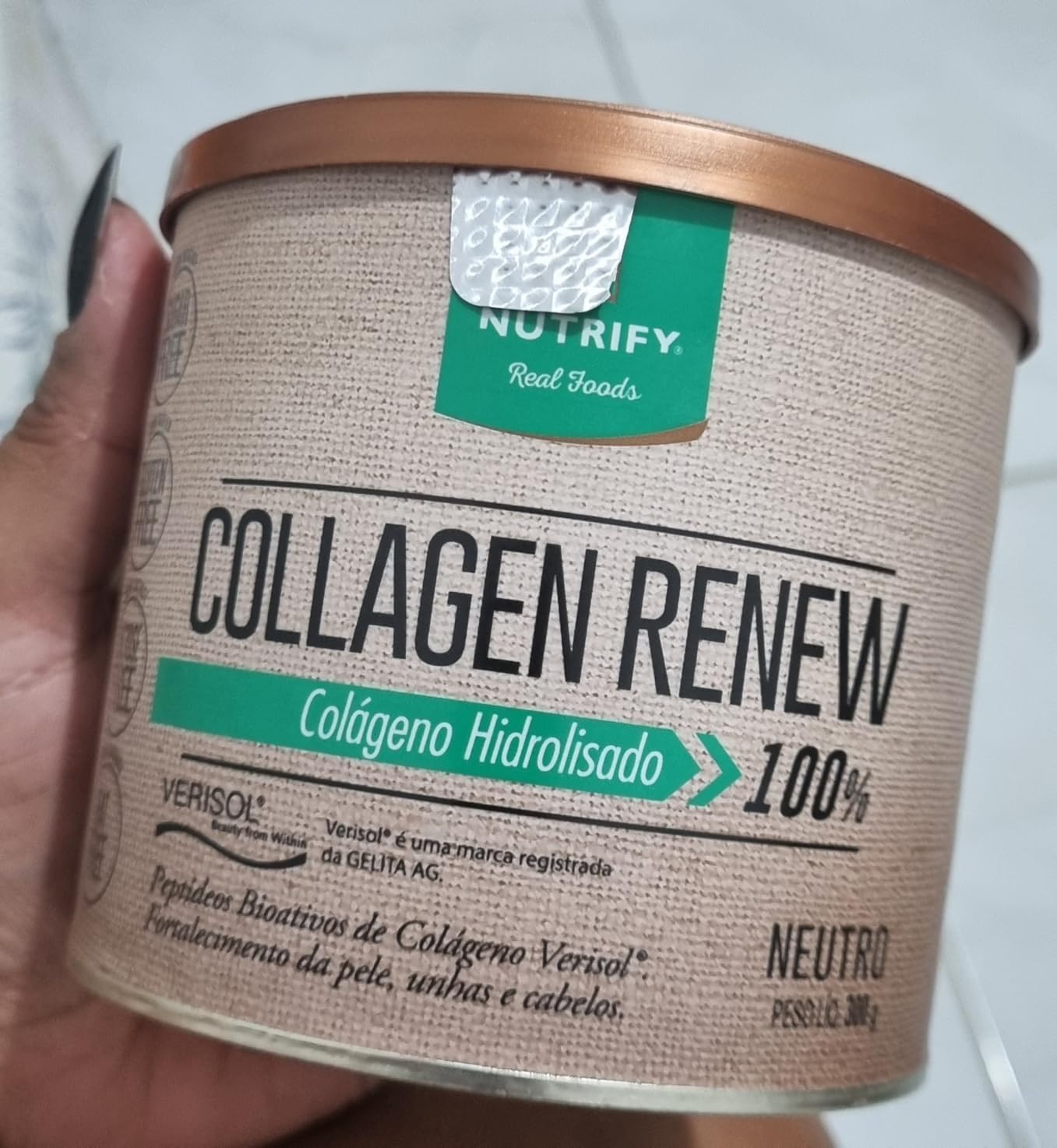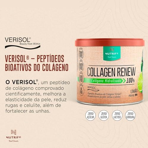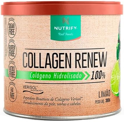 - A firmeza e a sustentação de nossa pele estão diretamente relacionadas à produção de colágeno pelo organismo, que diminui progressivamente ao longo dos anos, ocasionando flacidez e outros sinais de envelhecimento. À base de colágeno hidrolisado, a fórmula de COLLAGEN RENEW Nutrify oferta também 2,5 g de peptídeos bioativos de colágeno Verisol em cada porção, ajudando a recuperar a firmeza dos tecidos, melhorando sua aparência. COLLAGEN RENEW Nutrify é isento de açúcar, lactose, glúten, corantes e adoçantes artificiais, e conta com adição de vitaminas e minerais antioxidantes, que favorecem a absorção dos peptídeos e promovem o fortalecimento de unhas e cabelos.