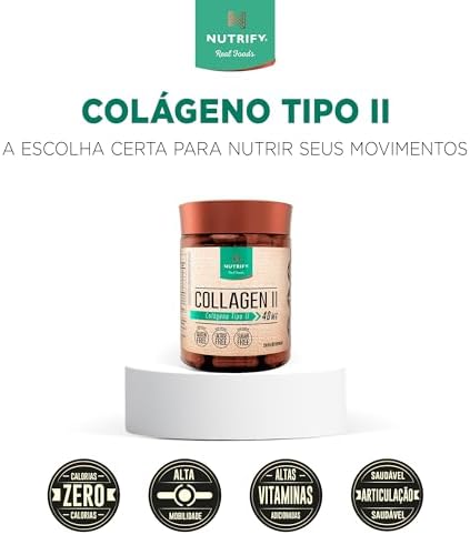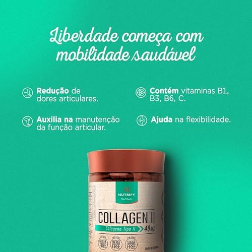 - A saúde de nossas articulações e nossa mobilidade estão ligadas aos níveis de colágeno tipo II presentes em nosso corpo, que diminuem com o passar dos anos. Collagen II Nutrify oferta esses peptídeos em sua forma pura, adicionada de vitaminas antioxidantes (B1, B3, B6, C e E), que favorecem sua absorção. Collagen II Nutrify não contém açúcar, lactose, glúten e adoçantes artificiais