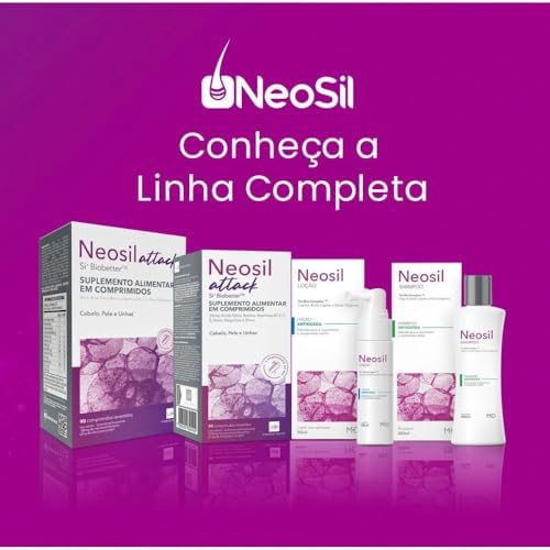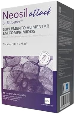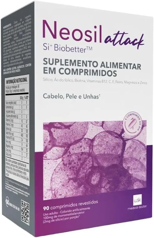 O que é o Neosil Attack? O Neosil Attack é um suplemento alimentar em comprimidos desenvolvido pela Under Skin, cuja fórmula contém Si+Biobetter, uma combinação exclusiva de Silício com colágeno, além de Ácido Fólico, Biotina, Ferro, Magnésio, Zinco e vitaminas B12, C e E. Juntos, esses ativos atuam de diferentes formas, auxiliando nos cuidados com a pele, unhas e cabelo. Confira: Pele Combatem os danos causados pelos radicais livres, evitando o envelhecimento precoce. Unhas Regeneram e estimulam o crescimento saudável das unhas. Cabelo Atuam na revitalização do cabelo, oferecendo mais elasticidade, força e brilho. Ainda, previne a queda dos fios e aumenta a sua espessura, acelerando a regeneração capilar. Como tomar o Neosil Attack?? Recomenda-se ingerir 1 cápsula por dia, ou conforme orientação médica.