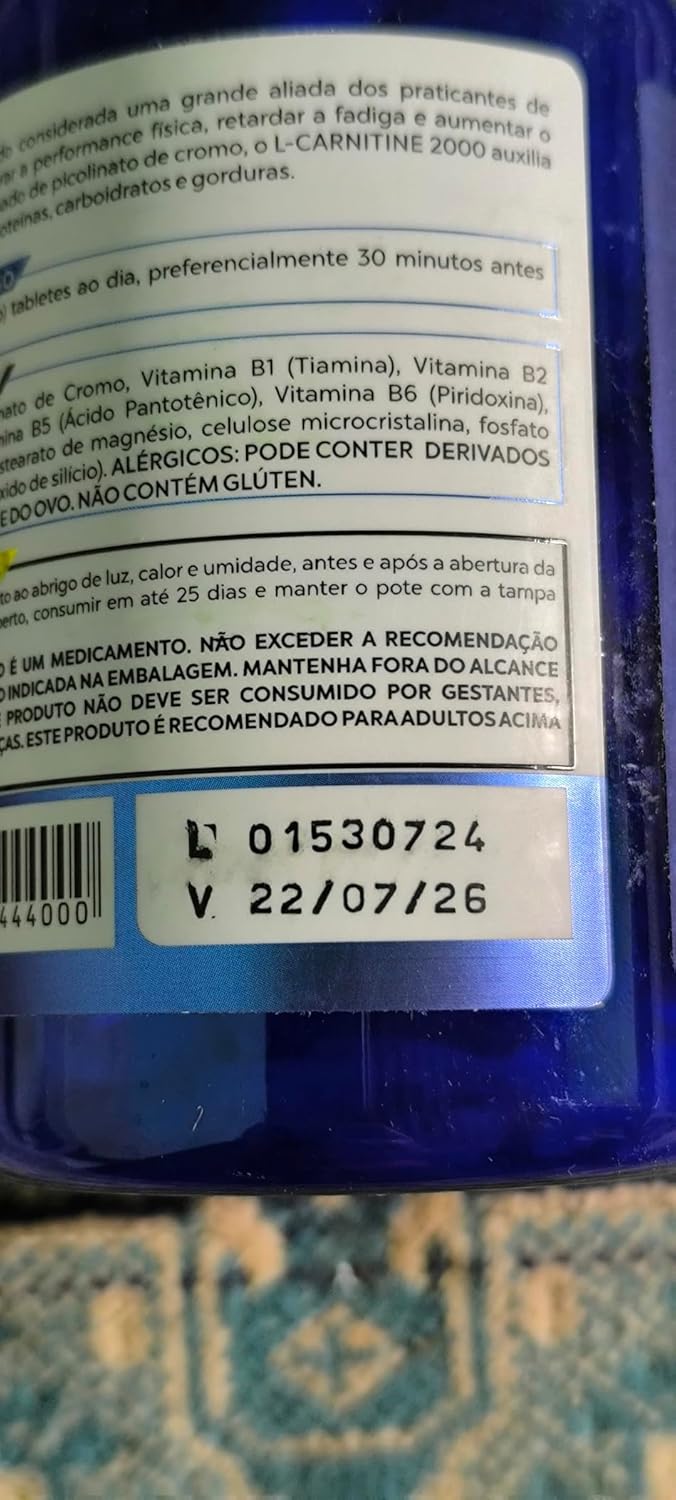 A L-Carnitina tem sido considerada uma grande aliada dos praticantes de exercícios, por melhorar a performance física, retardar a fadiga e aumentar o desempenho. Adicionado de picolinato de cromo, o L-CARNITINE 2000 auxilia no metabolismo de proteínas, carboidratos e gorduras. SUGESTÃO DE USO: Consumir 4 (quatro) tabletes ao , preferencialmente 30 minutos antes das refeições. INGREDIENTES: L- Carnitina, Picolinato de Cromo, Vitamina B1(Tiamina), Vitamina B2 (Riboflavina), Vitamina B5 (Ácido Pantotênico), Vitamina B6 (Piridoxina), excipiente q.s.p. (estearato de magnésio, celulose microcristalina, fosfato tricálcico PVP, e dióxido de silício). ALÉRGICOS: PODEM CONTER TRAÇOS DE DERIVADOS DO LEITE, da SOJA e DO OVO.
