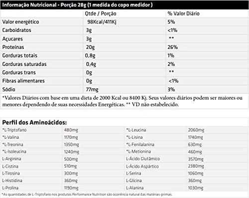 A porção de 28g fornece 20g de Proteína, sendo 9,5g de Aminoácidos Essências, dos quais 4,5g são de BCAA's.