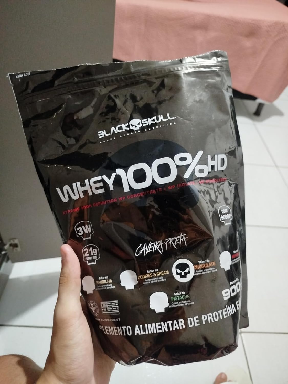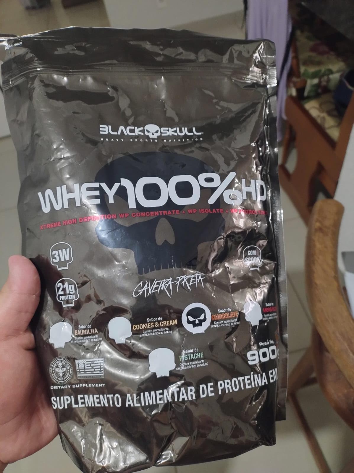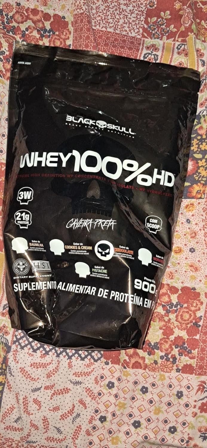 Whey 100% HD é mais um mega suplemento da linha caveira preta! Composto por três tipos de whey protein (concentrado, isolado e hidrolisado), ele é uma ótima opção para auxiliar no ganho de massa muscular! Além disso, sua composição conta também com a adição de BCAA, aminoácidos de cadeia ramificada que contribuem para uma melhor recuperação pós-treino. INGREDIENTES: Proteína concentrada do soro do leite, proteína isolada do soro de leite, proteína hidrolisada do soro do leite, l-leucina, l-isoleucina, l-valina, aromatizante, espessante goma xantana, corante vermelho beterraba, acidulante ácido cítrico, edulcorantes sucralose e acessulfame de potássio. CONTÉM LACTOSE. NÃO CONTÉM GLÚTEN. COMO CONSUMIR WHEY 100% HD? Misture 3 colheres de sopa (aprox. 30g) de Whey 100% HD em 150 ml de água, ou de acordo com a consistência desejada, e consuma uma vez ao dia ou de acordo com a orientação de um profissional especializado. Recomendação para adultos acima de 19 anos de idade. WHEY PROTEIN Um dos suplementos mais consumidos do mundo atualmente por diversas áreas no esporte como também na nutrição clínica, derivado do soro do leite, mais conhecido como Whey Protein, garante proteína de alto valor biológico com objetivos de manutenção muscular, auxiliar no anabolismo e recuperação das fibras musculares de praticantes de atividades físicas em geral até em pacientes que necessitam de uma dieta enteral. As proteínas obtidas a partir do soro do leite são classificados conforme o seu grau de processamento, como: proteínas concentradas, isoladas e hidrolisadas. SRO – um processo de refinação que remove os contaminantes usando pressão da água para forçar as moléculas através de uma membrana semipermeável. Durante esse processo, os contaminantes são filtrados e lavados, deixando a proteína mais pura.