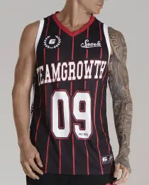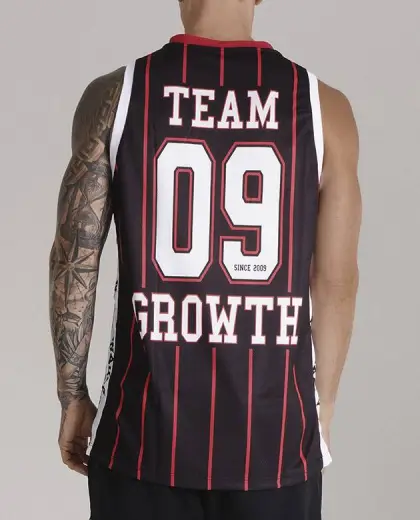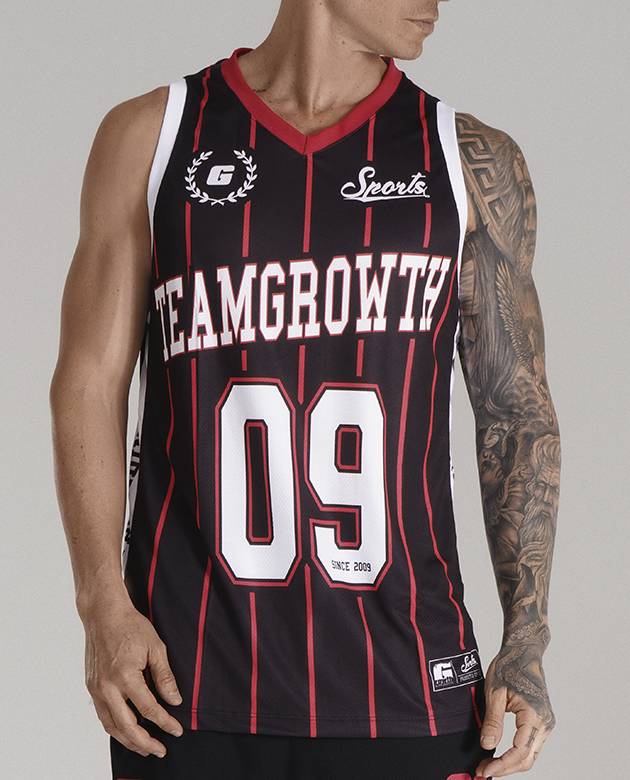 – COLEÇÃO GROWTH SPORTS- – REGATA GROWTH SPORTS 09 PRETO/VERMELHO/BRANCO – COMPOSIÇÃO 100% POLIÉSTER TRAMADO LEVE ACABAMENTO EM RIBANA ESTAMPA EM SUBLIMAÇÃO DIGITAL