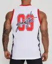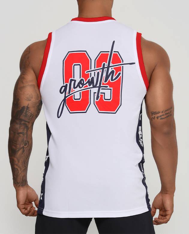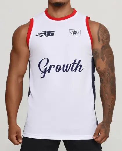- COLEÇÃO GROWTH SPORTS- - REGATA GROWTH SPORTS 09 BRANCO/AZUL/VERMELHO - COMPOSIÇÃO 100% POLIÉSTER TRAMADO LEVE ACABAMENTO EM RIBANA ESTAMPA EM SUBLIMAÇÃO DIGITAL