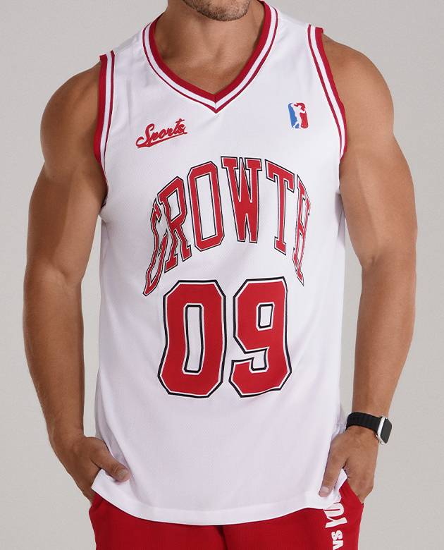 – COLEÇÃO GROWTH SPORTS- – REGATA GROWTH SPORTS 09 BRANCO – VERMELHO – COMPOSIÇÃO 100% POLIÉSTER TRAMADO LEVE ACABAMENTO EM RETILÍNEAS ESTAMPA EM SILK