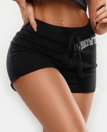 COLEÇÃO GROWTH FEMININA - - SHORT MOLETOM PRETO GROWTH - DESCRIÇÃO SHORT CONFECCIONADO EM TECIDO 3 CABOS SEM FELPA MODELAGEM BÁSICA SEM BOLSOS COM DETALHE BORDADO E BARRA À FIO AJUSTE DE CORDÃO BORDADO FRONTAL EM ALTO.