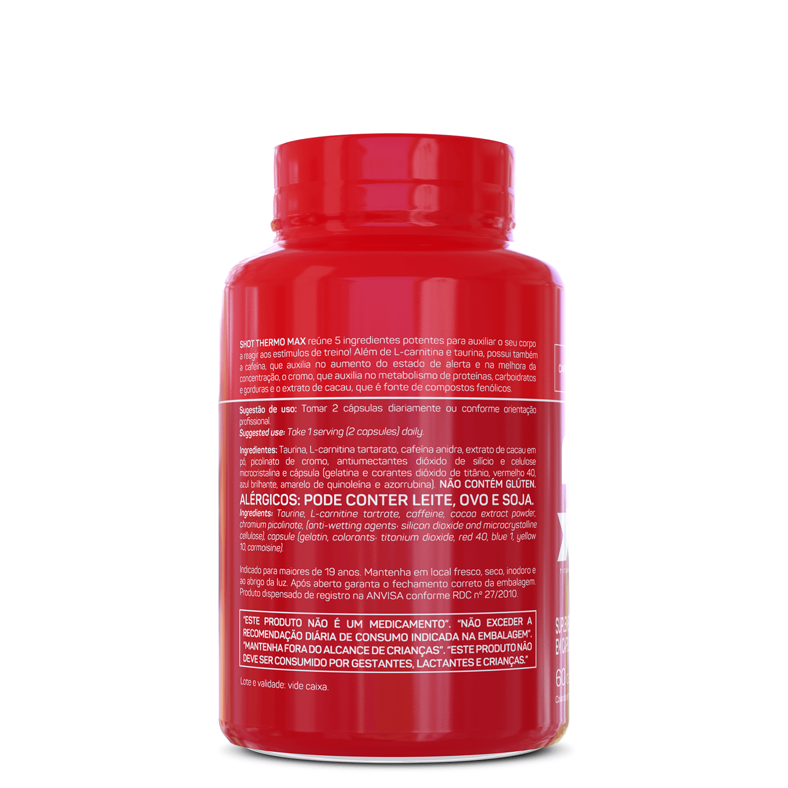 SHOT THERMO MAX reúne 5 ingredientes potentes para auxiliar o seu corpo a reagir aos estímulos de treino! Além de L-carnitina e taurina, possui também a cafeína, que auxilia no aumento do estado de alerta e na melhora da concentração, o cromo, que auxilia no metabolismo de proteínas, carboidratos e gorduras e o extrato de cacau, que é fonte de compostos fenólicos.