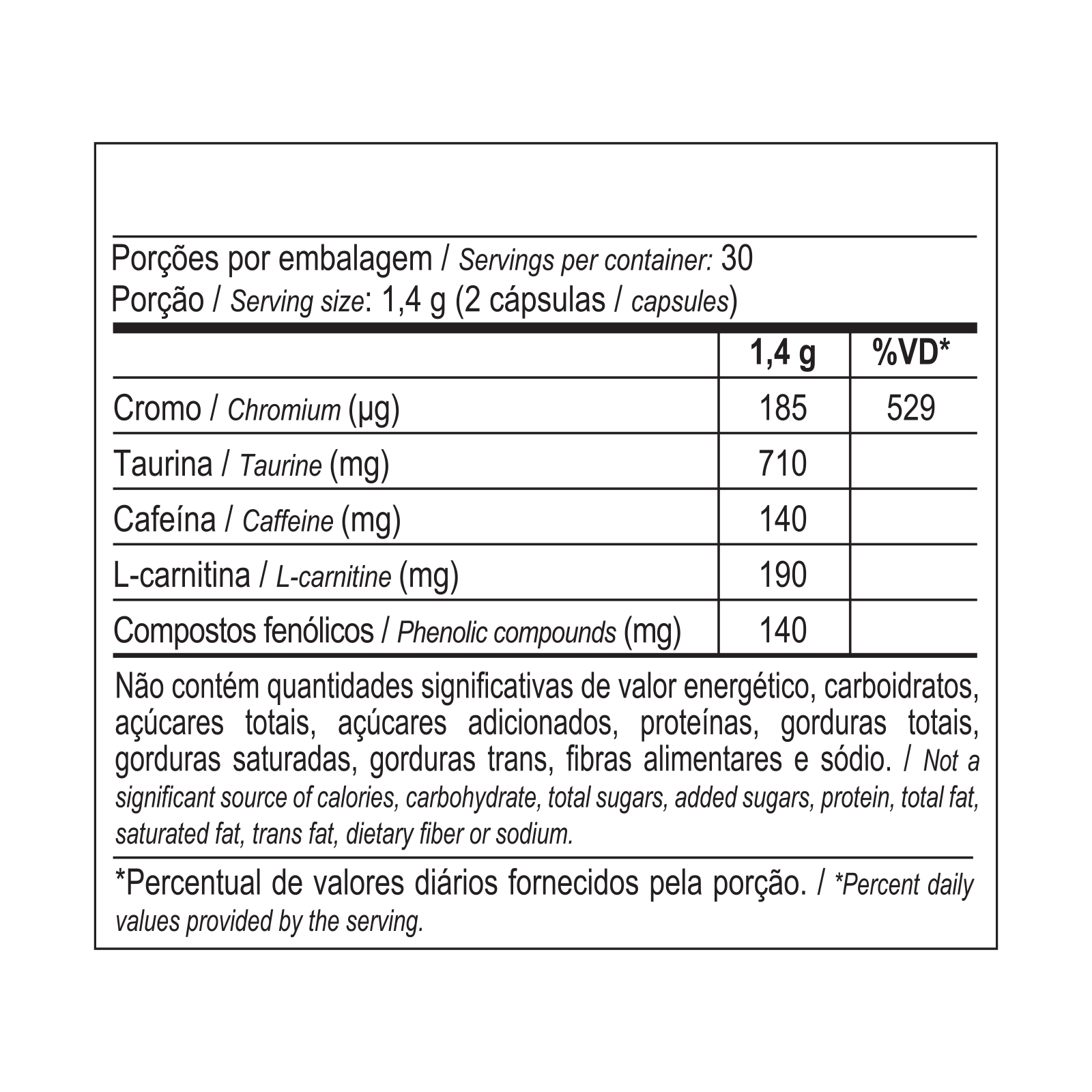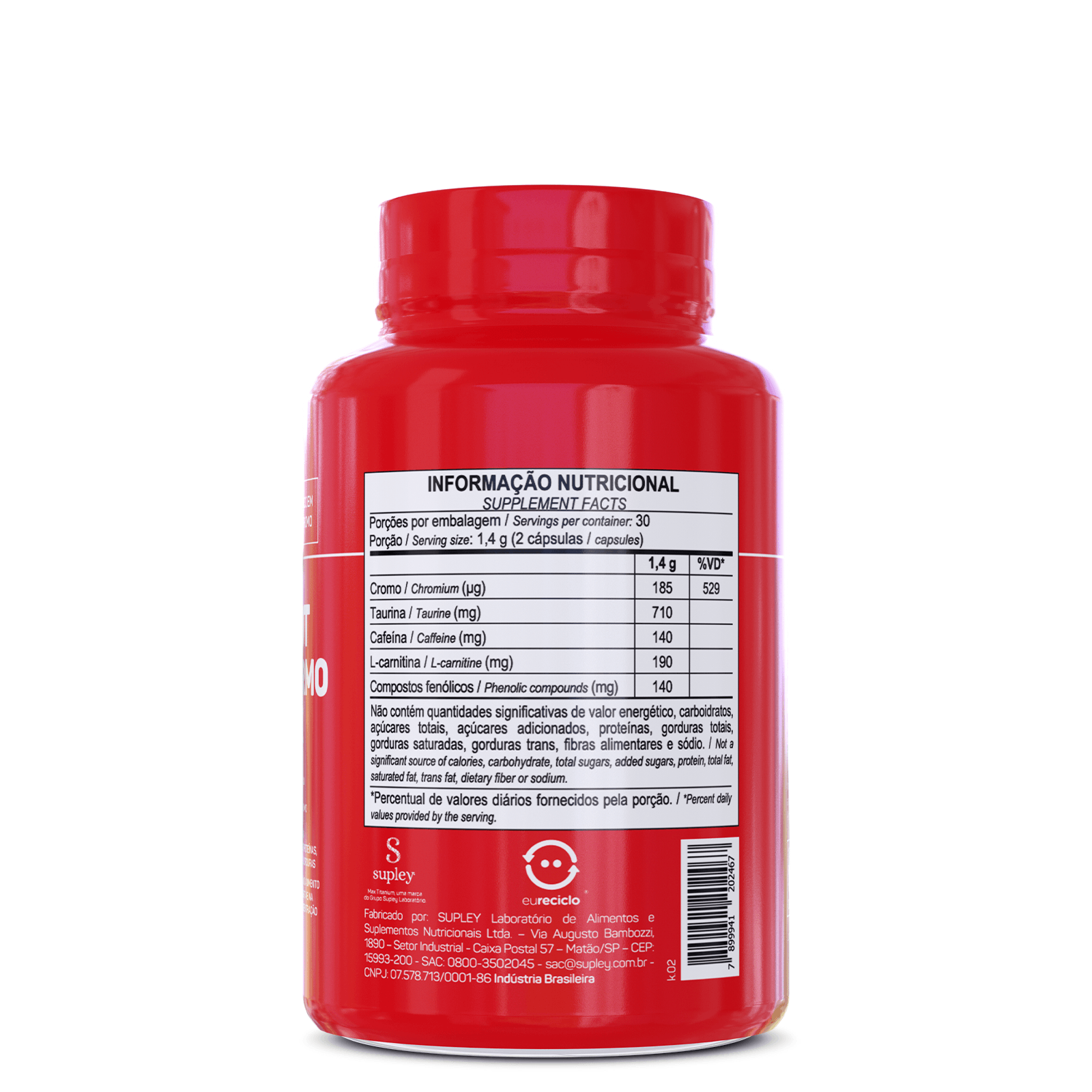 Taurina, L-carnitina tartarato, cafeína anidra, extrato de cacau em pó, picolinato de cromo, antiumectantes dióxido de silício e celulose microcristalina e cápsula (gelatina e corantes dióxido de titânio, vermelho 40, azul brilhante, amarelo de quinoleéna e azorrubina).