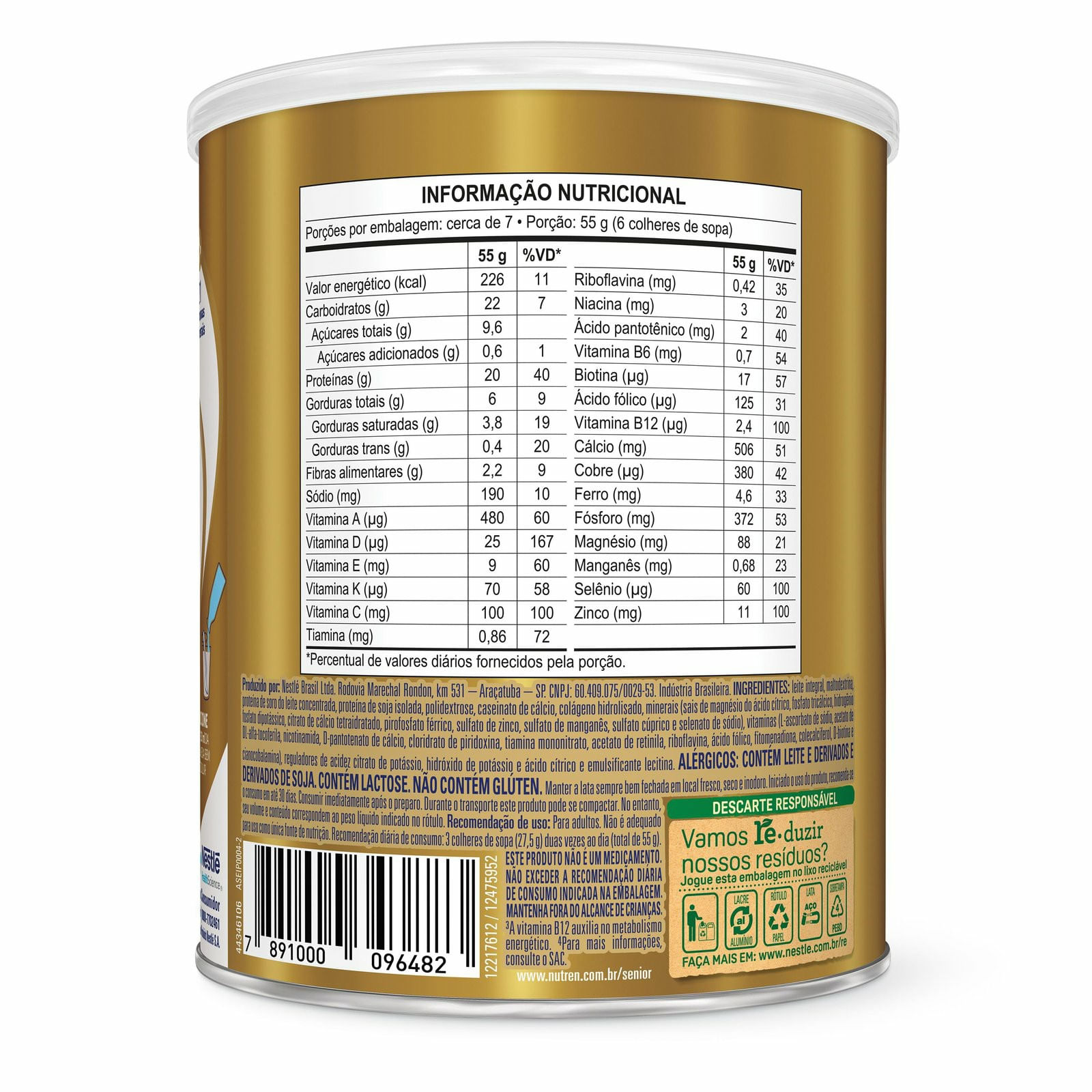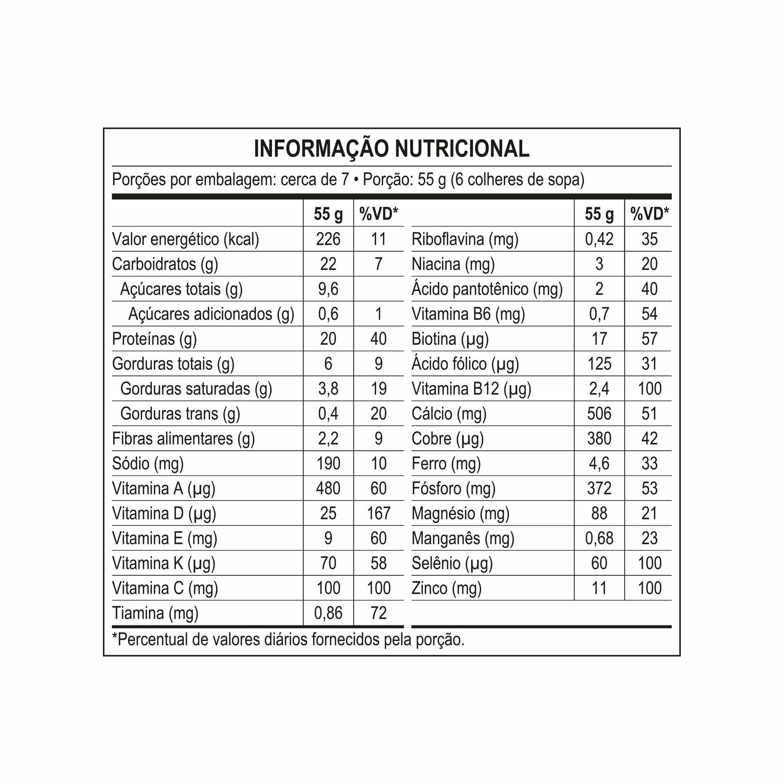 Ingredientes: Leite integral, maltodextrina, proteína de soro do leite concentrada, proteína de soja isolada, polidextrose, caseinato de cálcio, colágeno hidrolisado, minerais (sais de magnésio do ácido cítrico, fosfato tricálcico, hidrogênio fosfato dipotássico, citrato de cálcio tetraidratado, pirofosfato férrico, sulfato de zinco, sulfato de manganês, sulfato cúprico e selenato de sódio), vitaminas (L-ascorbato de sódio, acetato de DL-alfa-tocoferila, nicotinamida, D-pantotenato de cálcio, cloridrato de piridoxina, tiamina mononitrato, acetato de retinila, riboflavina, ácido fólico, fitomenadiona, colecalciferol, D-biotina e cianocobalamina), reguladores de acidez citrato de potássio, hidróxido de potássio e ácido cítrico e emulsificante lecitina.