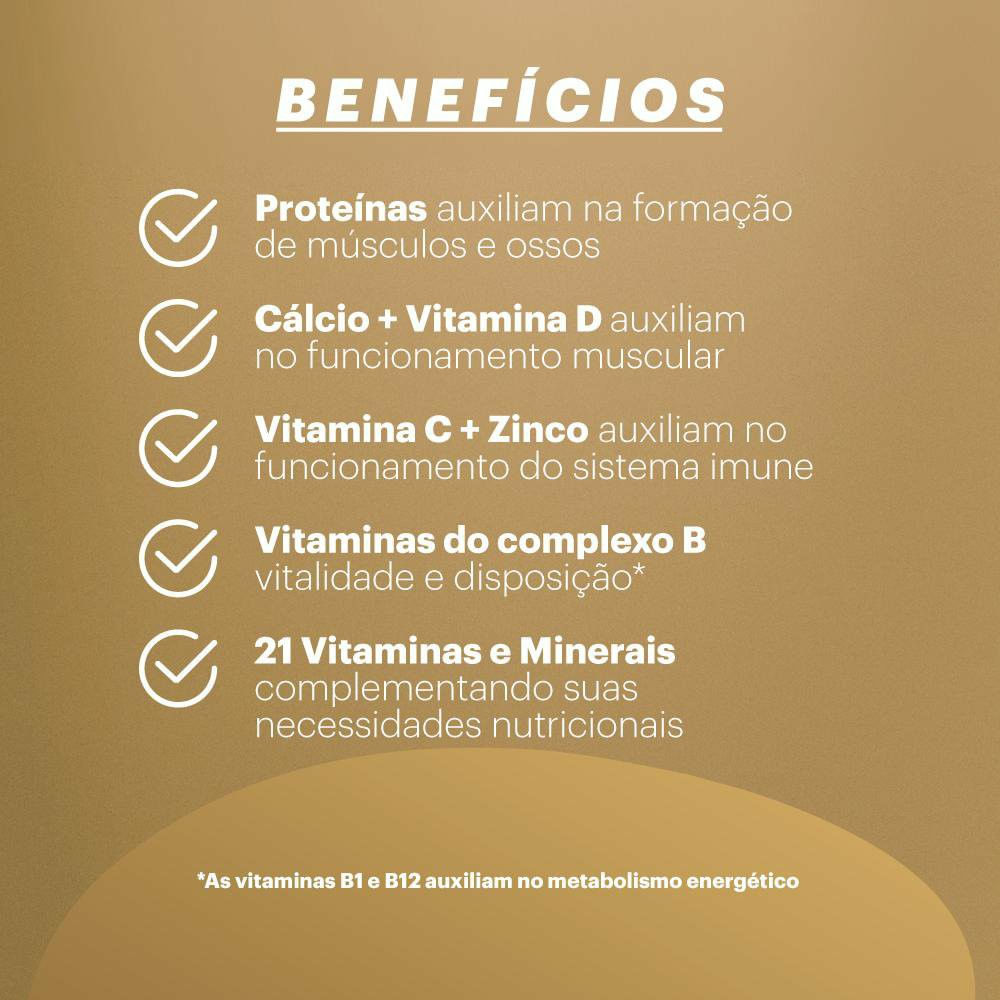 Suplemento alimentar, com cálcio, proteínas, vitamina D e outros nutrientes essenciais.