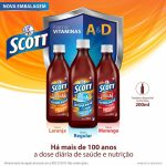 Scott é um suplemento alimentar à base de óleo de fígado de bacalhau, rico em Vitaminas A e D. A vitamina A é importante para a manutenção da visão e funcionamento normal do sistema imunológico. Também é usada pelo corpo para manter a pele saudável¹. A vitamina D é necessária para absorver o cálcio eficientemente, o que é necessário para ossos e dentes saudáveis². Também contribui para o funcionamento normal do sistema imunológico e desempenha um papel no desenvolvimento e na função muscular². 1. Wintergerst ES, et al. Contribution of selected vitamins and trace elements to immune function. Ann Nutr Metab 2007;51:301-23. 2. WHO and FAO. Vitamin D. In: ________ Vitamin and mineral requirements in human nutrition. 2nd Ed. Bangkok, Thailand. 2004. 341 p. cap. 3, 45p FORMATO, TAMANHO E SABOR: Frasco com 400ml, sabor regular. INDICAÇÃO: Suplementação diária de Vitaminas A e D. MODO DE USO: Adultos acima de 19 anos: consumir 2 colheres de chá ( 10ml), 1 vez ao dia. CONHEÇA TODA A FAMÍLIA SCOTT: Scott está disponível nos sabores regular, laranja e morango nos tamanhos de 200ml e 400ml.