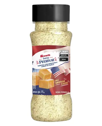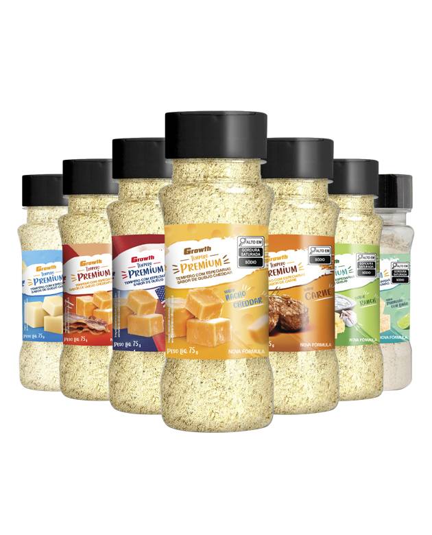 Para complementar e adicionar mais sabor às suas receitas, a Growth criou o tempero ranch, um tempero especial feito com os melhores ingredientes: queijo cheddar em pó, cebola em pó, tomate e alho em pó. Assim como os temperos de nacho cheddar, cheddar branco e cheddar com bacon, este tempero também não contém glúten.