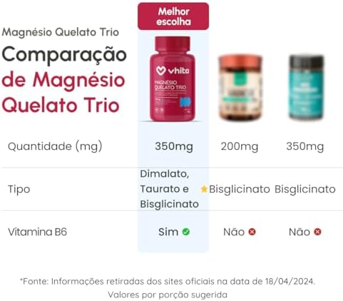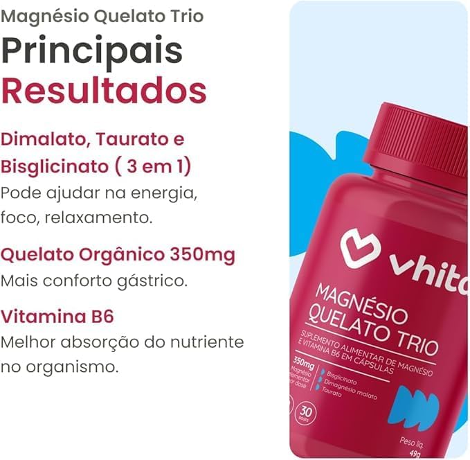 Vhita Magnesio Quelato Trio, Dimalato, Bisglicinato e Taurato, com Vitamina B6, 60 53 g