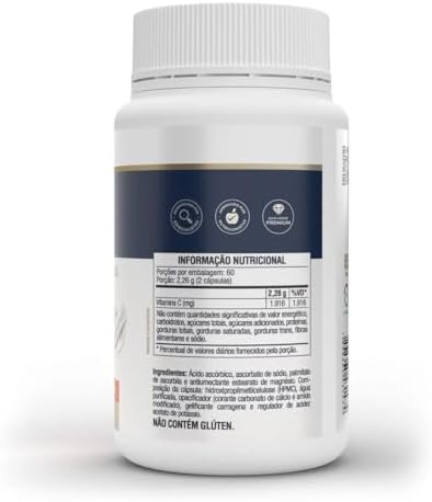 Suplemento alimentar de vitamina C em cápsulas. Suplemento alimentar composto pela combinação de três diferentes fontes de Vitamina C: ácido ascórbico, ascorbato de sódio e palmitato de ascorbila. Auxilia no funcionamento do sistema imune; É um antioxidante que auxilia na proteção dos danos causados pelos radicais livres; Auxilia na formação do colágeno; 1.916mg de Vitamina C (4.258% da IDR) por porção. Auxilia na regeneração da forma reduzida da vitamina E; Auxilia na absorção de ferro dos alimentos; Auxilia no metabolismo energético e no metabolismo de proteínas e gorduras.