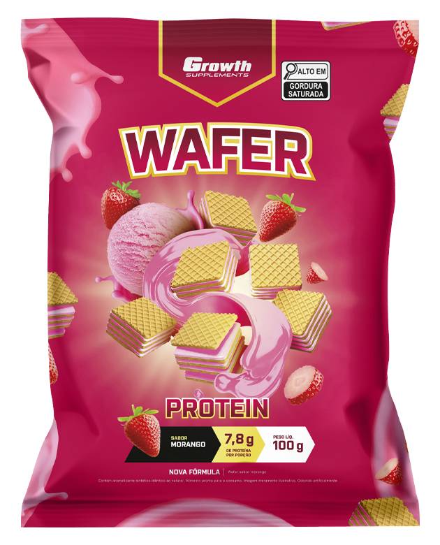 O Wafer Protein Growth é formado por cubos de wafer com sabor de creme e biscoito ou morango, além de possuir um recheio proteico. Sua apresentação acaba se tornando uma boa opção para quem precisa comer fora de casa ou em movimento.