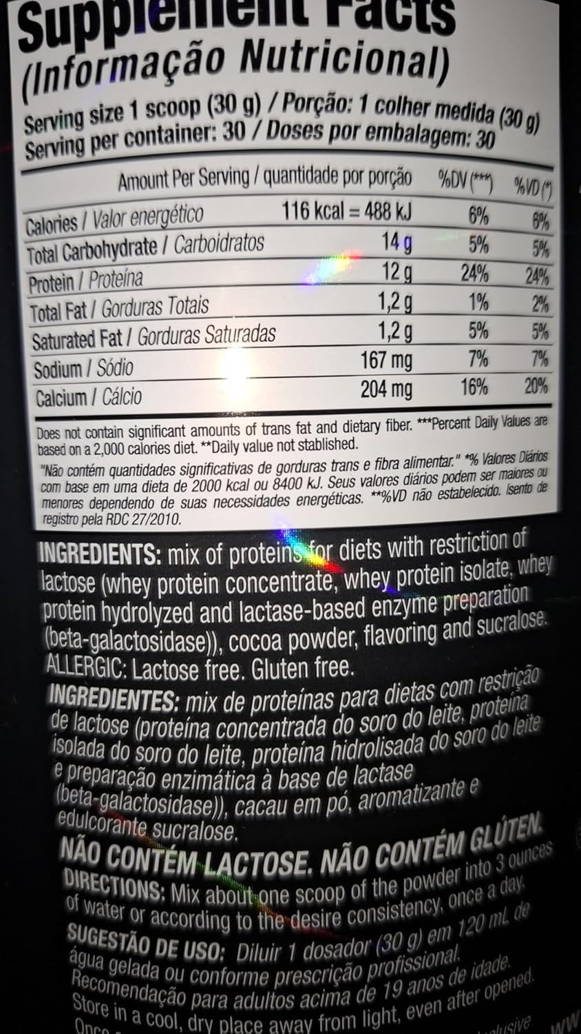 O WHEY 100% HD™ Gourmet refil de 900 gramas da BLACK SKULL™ é o seu aliado definitivo para uma recuperação muscular superior e crescimento explosivo. Esse suplemento de alta performance combina a potência do Whey Protein Concentrado (WPC), Isolado (WPI) e Hidrolisado (WPH) em um blend 3W, projetado para atletas e praticantes de esportes que buscam o máximo. Desenvolvido para Atletas e Praticantes de Atividade Física, o WHEY 100% HD™ serve como base para a reparação e construção muscular após treinos intensos. Sua fórmula 3W garante que seus músculos recebam nutrição constante, com proteínas de diferentes velocidades de absorção, promovendo hipertrofia e uma recuperação mais eficiente. O diferencial do WHEY 100% HD™ Gourmet está na sua formulação tripla, combinando WPC para uma liberação gradual, WPI para rápida absorção e WPH para uma entrega rápida de aminoácidos. Esse blend otimiza a janela anabólica, oferece alto valor biológico e auxilia na manutenção de um balanço nitrogenado positivo. A embalagem refil de 900 gramas garante praticidade e um excelente custo-benefício para sua suplementação diária, enquanto a linha Gourmet proporciona uma experiência de sabor inigualável. Para aproveitar ao máximo os benefícios, misture uma porção (medidor incluído) do WHEY 100% HD™ Gourmet com água ou sua bebida preferida. Consuma preferencialmente no pós-treino, para maximizar a recuperação muscular, ou a qualquer momento do dia para complementar sua ingestão proteica. Se necessário, ajuste a dosagem conforme suas necessidades nutricionais e orientação profissional. O refil de WHEY 100% HD™ Gourmet da BLACK SKULL™ é ideal para atletas de alta performance, fisiculturistas, praticantes de atividades físicas intensas e qualquer indivíduo que busca otimizar a recuperação muscular, promover o crescimento da massa magra e melhorar o desempenho geral. É a escolha perfeita para quem busca um suplemento completo e eficaz. Este suplemento da BLACK SKULL™ é um blend proteico de última geração, contendo as três formas mais eficientes de proteína do soro do leite para garantir um perfil completo de aminoácidos. A combinação de Whey Concentrado, Isolado e Hidrolisado oferece diferentes taxas de digestão e absorção, garantindo um suporte nutricional contínuo para seus músculos. É ideal para quem busca maximizar a síntese proteica e acelerar a recuperação. ALÉRGICOS: CONTÉM DERIVADOS DE LEITE, CONTÉM LACTOSE. NÃO CONTÉM GLÚTEN.